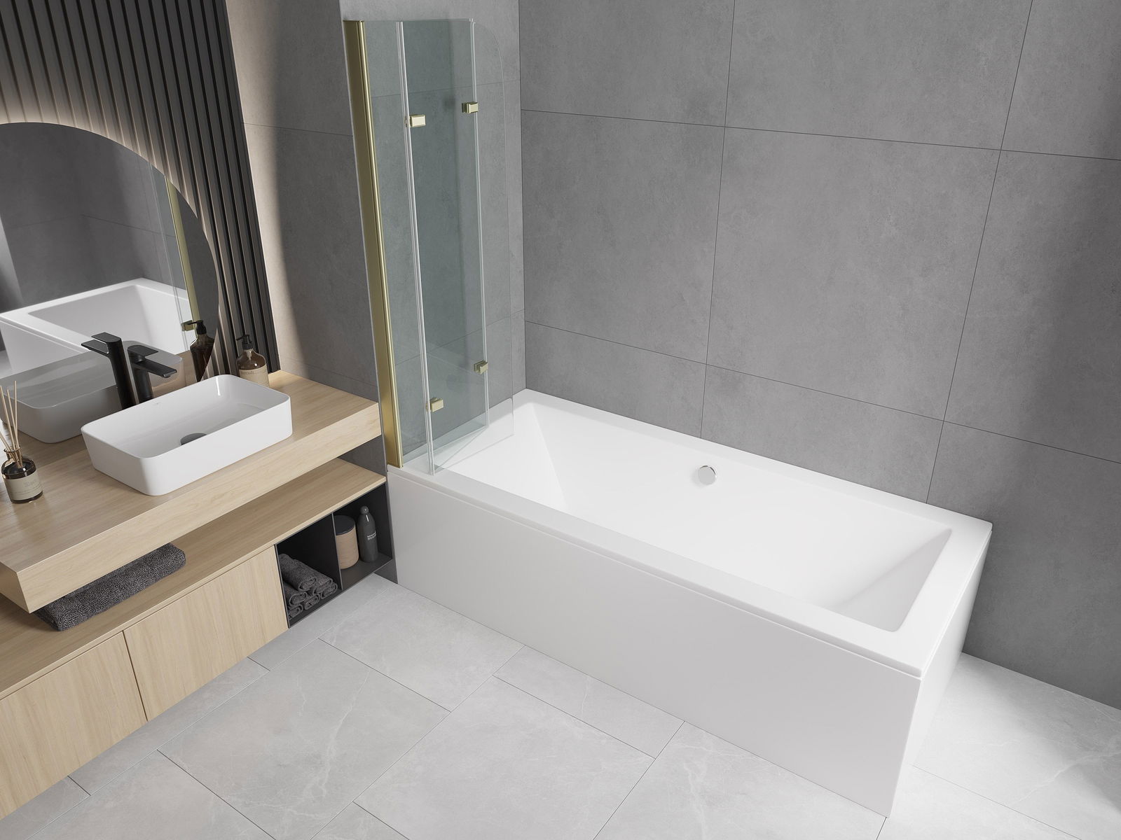 Scherm gemaakt van drie vleugels met de mogelijkheid om op te vouwen. Deze oplossing bespaart meer ruimte in de badkamer en maakt het mogelijk om de overige ruimte vrij te gebruiken wanneer we de badzone niet gebruiken.