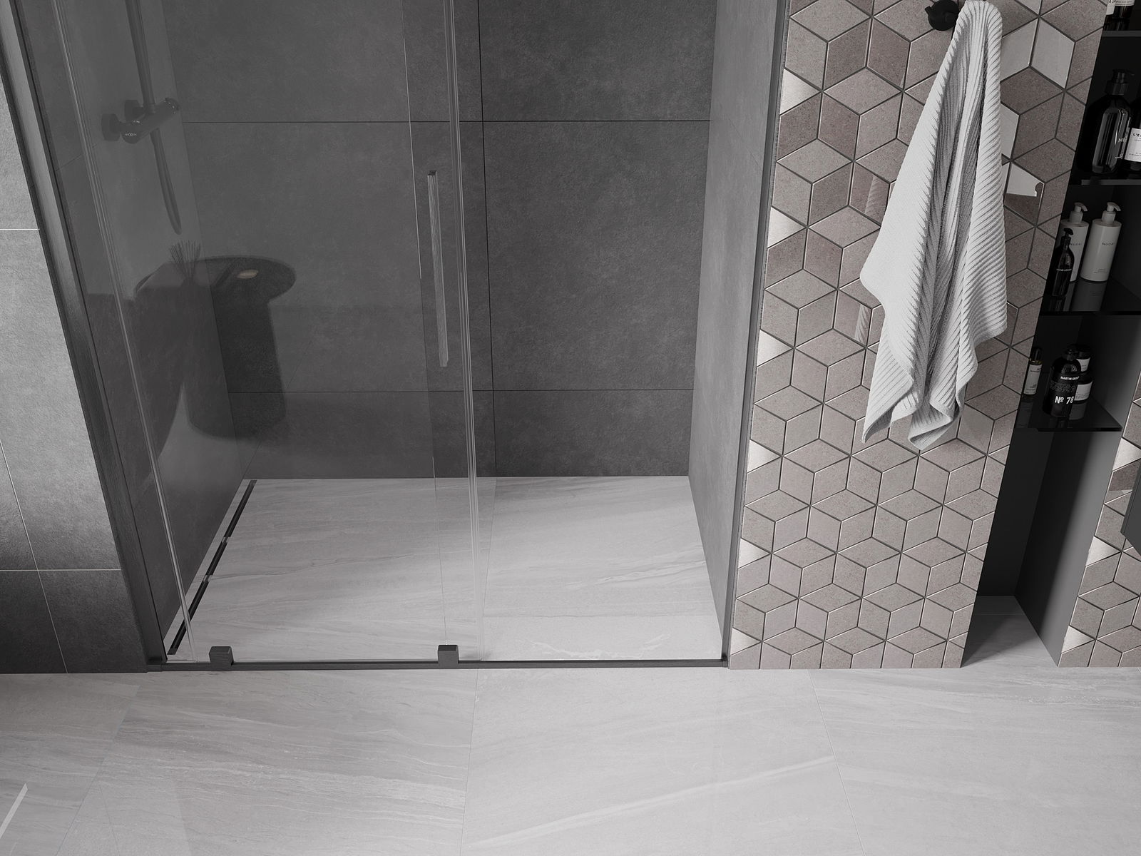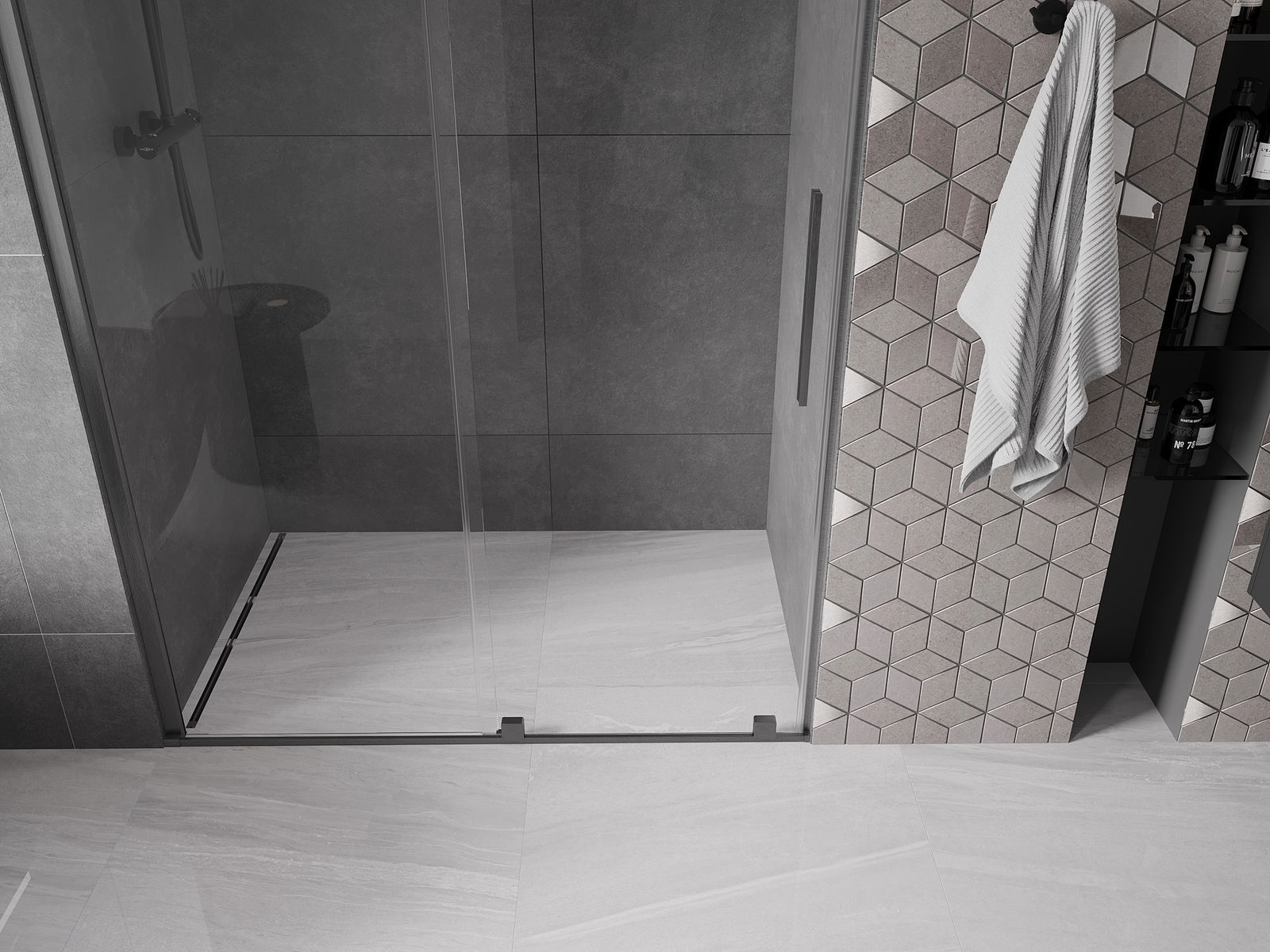 Het handige en comfortabele handvat is gemaakt van roestvrij staal. De modieuze vorm in combinatie met de afwerking die is afgestemd op de kleur van de profielen geeft het geheel een moderne en stijlvolle uitstraling, en benadrukt de esthetiek van elke badkamer.