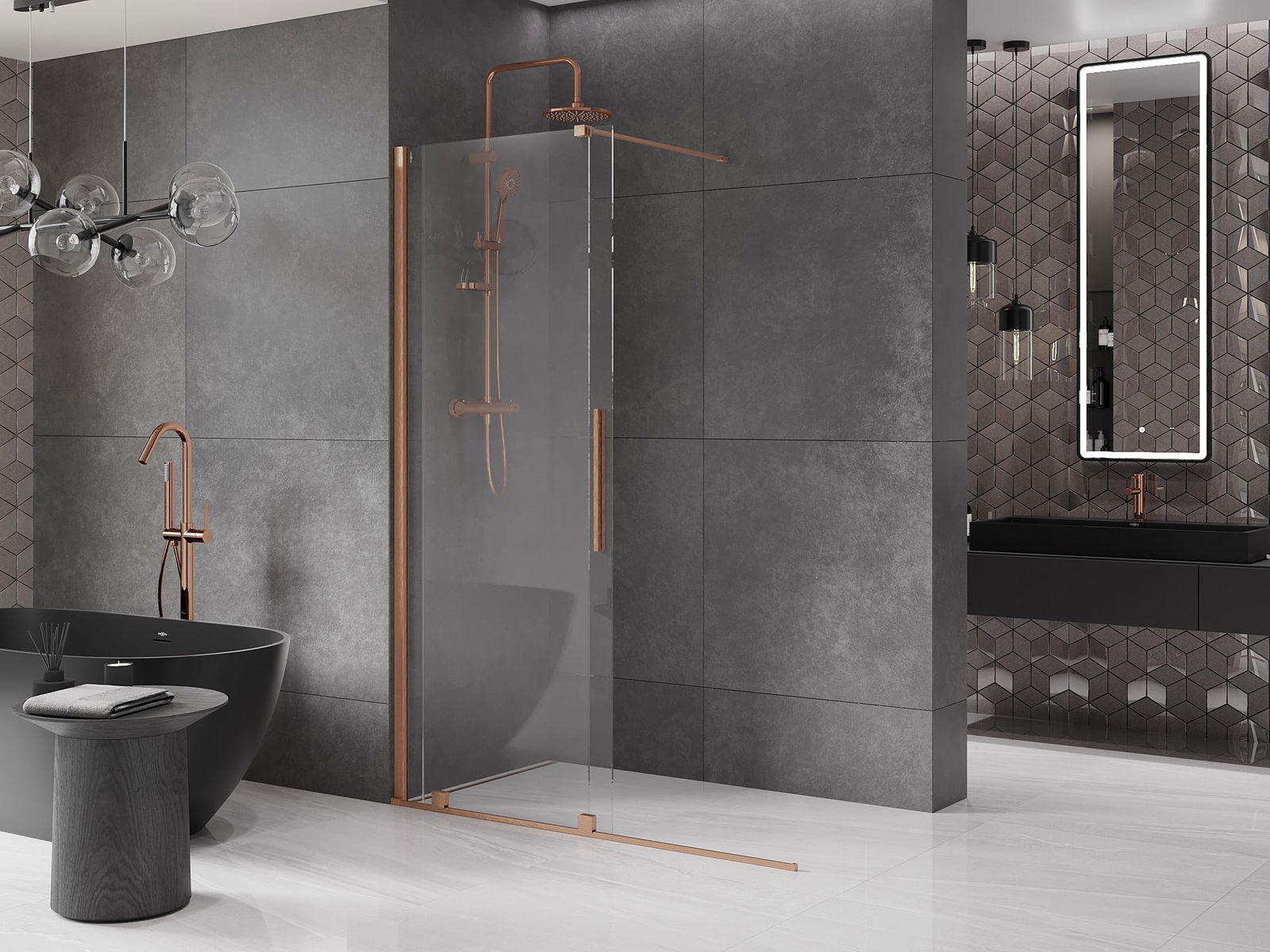 Het handige en comfortabele handvat is gemaakt van roestvrij staal. De modieuze vorm in combinatie met de afwerking die is afgestemd op de kleur van de profielen geeft het geheel een moderne en stijlvolle uitstraling, en benadrukt de esthetiek van elke badkamer.