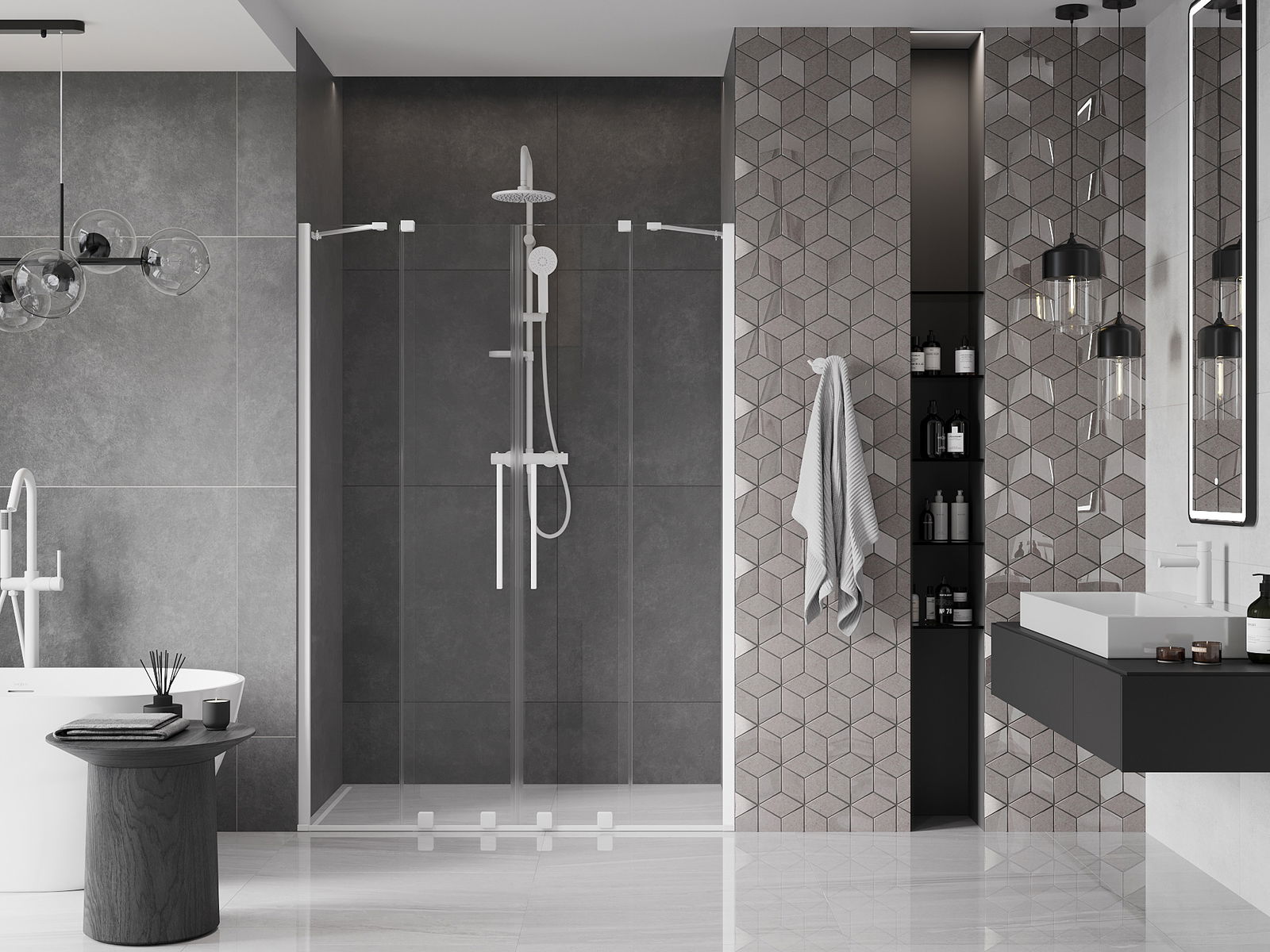 Het handige en comfortabele handvat is gemaakt van roestvrij staal. De modieuze vorm in combinatie met de afwerking die is afgestemd op de kleur van de profielen geeft het geheel een moderne en stijlvolle uitstraling, en benadrukt de esthetiek van elke badkamer.