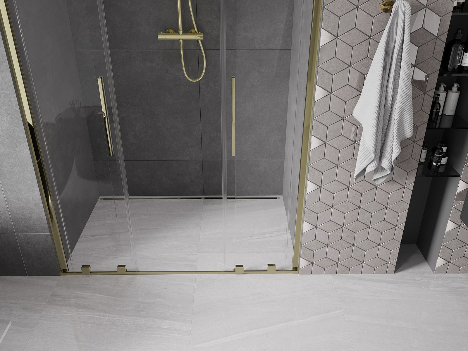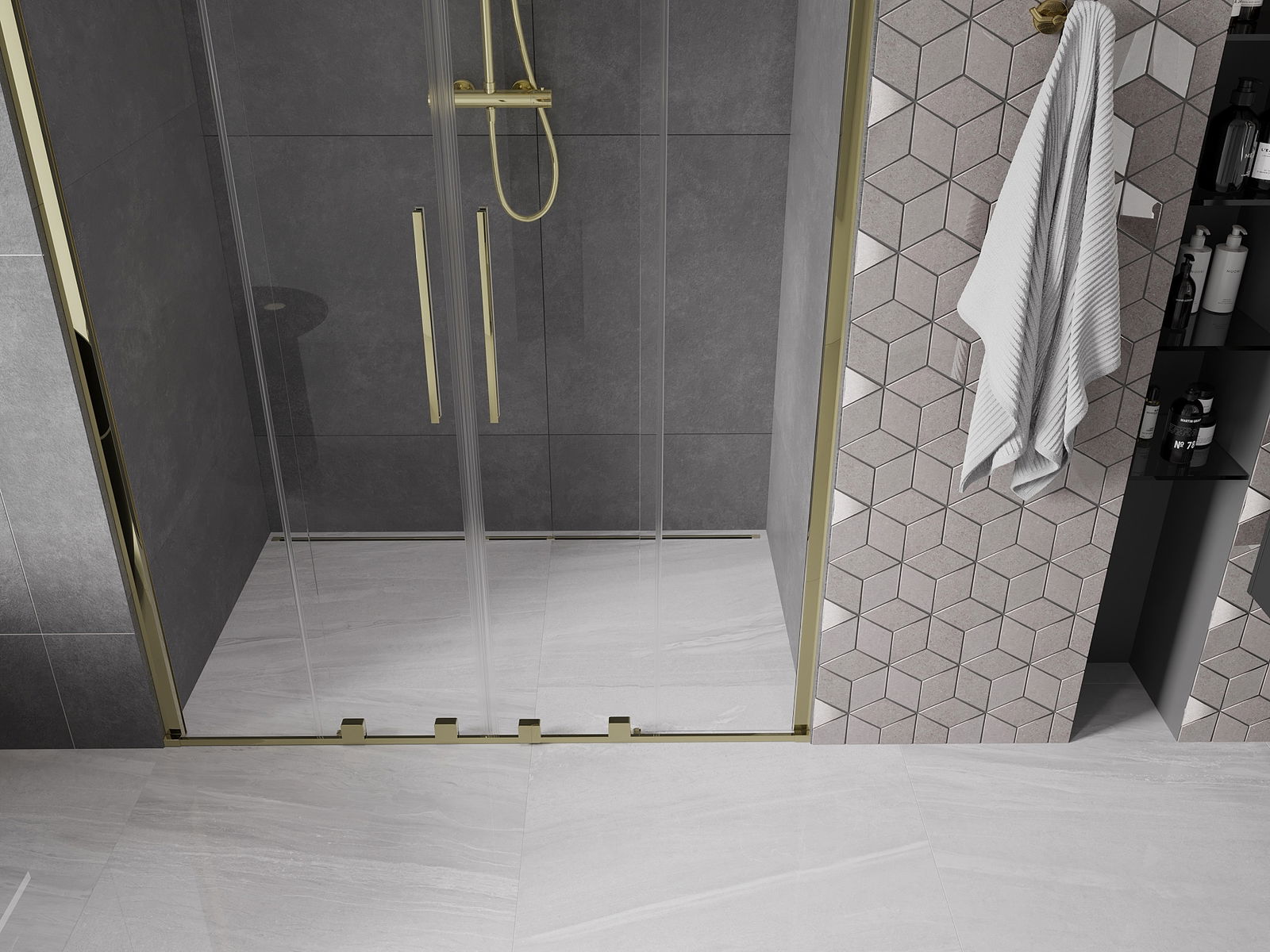 Het handige en comfortabele handvat is gemaakt van roestvrij staal. De modieuze vorm in combinatie met de afwerking die is afgestemd op de kleur van de profielen geeft het geheel een moderne en stijlvolle uitstraling, en benadrukt de esthetiek van elke badkamer.