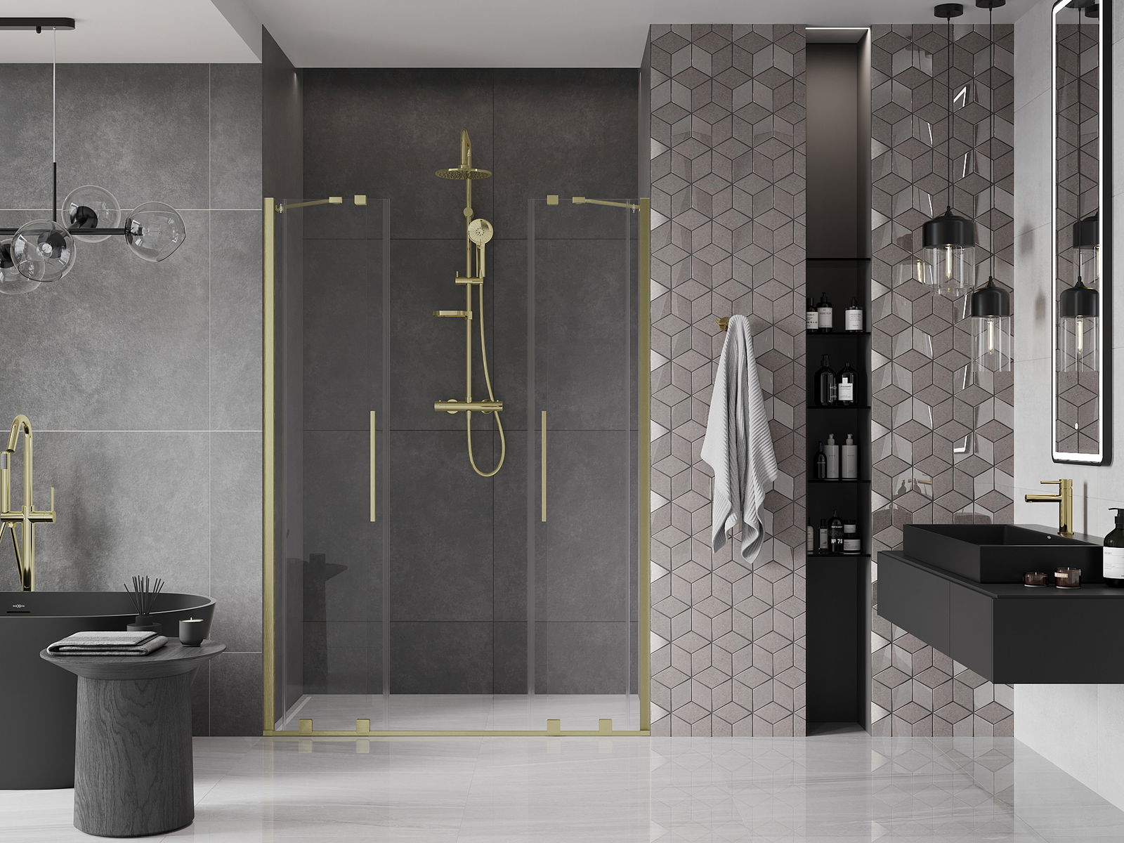 Het handige en comfortabele handvat is gemaakt van roestvrij staal. De modieuze vorm in combinatie met de afwerking die is afgestemd op de kleur van de profielen geeft het geheel een moderne en stijlvolle uitstraling, en benadrukt de esthetiek van elke badkamer.