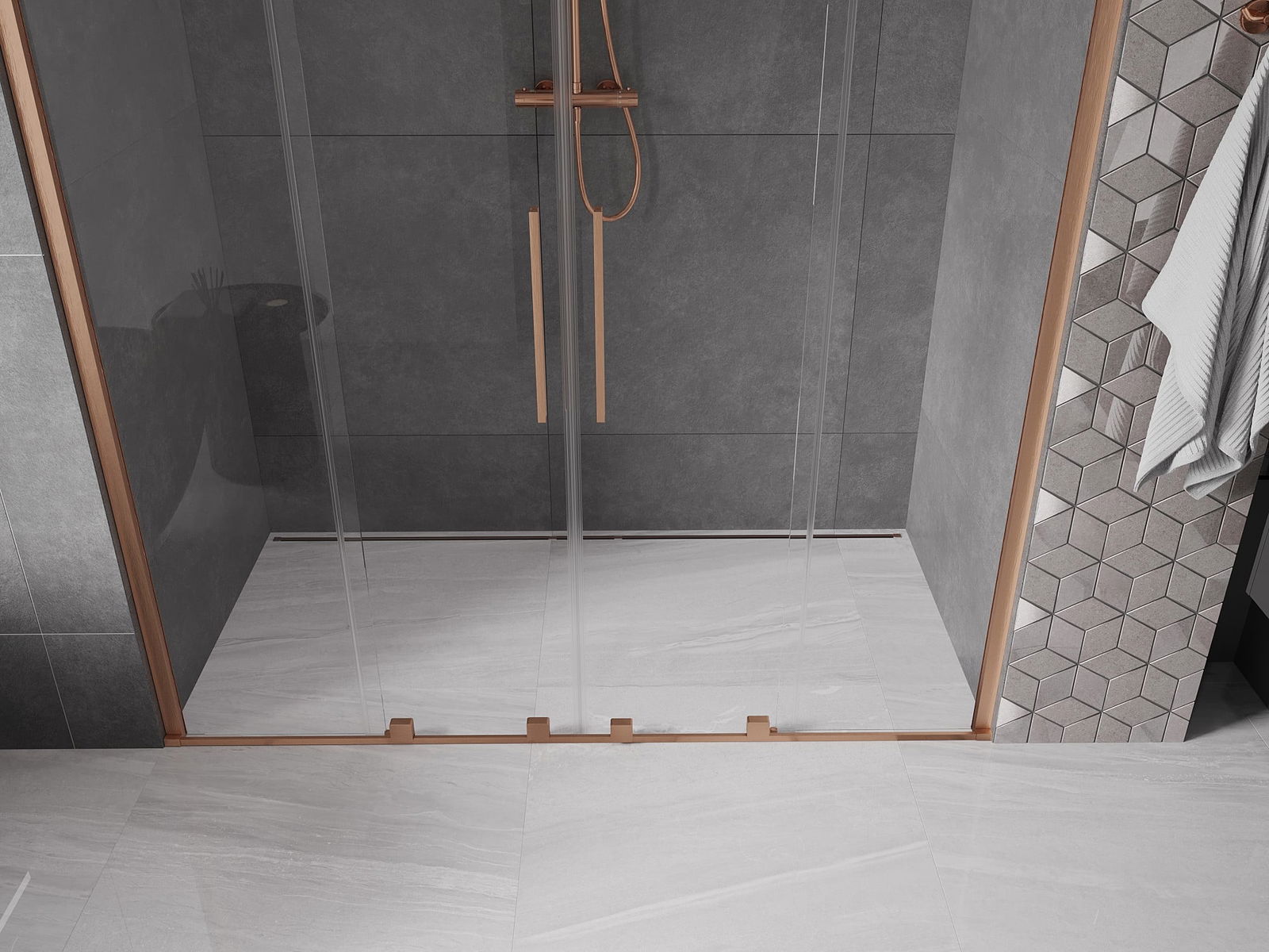 Het handige en comfortabele handvat is gemaakt van roestvrij staal. De modieuze vorm in combinatie met de afwerking die is afgestemd op de kleur van de profielen geeft het geheel een moderne en stijlvolle uitstraling, en benadrukt de esthetiek van elke badkamer.