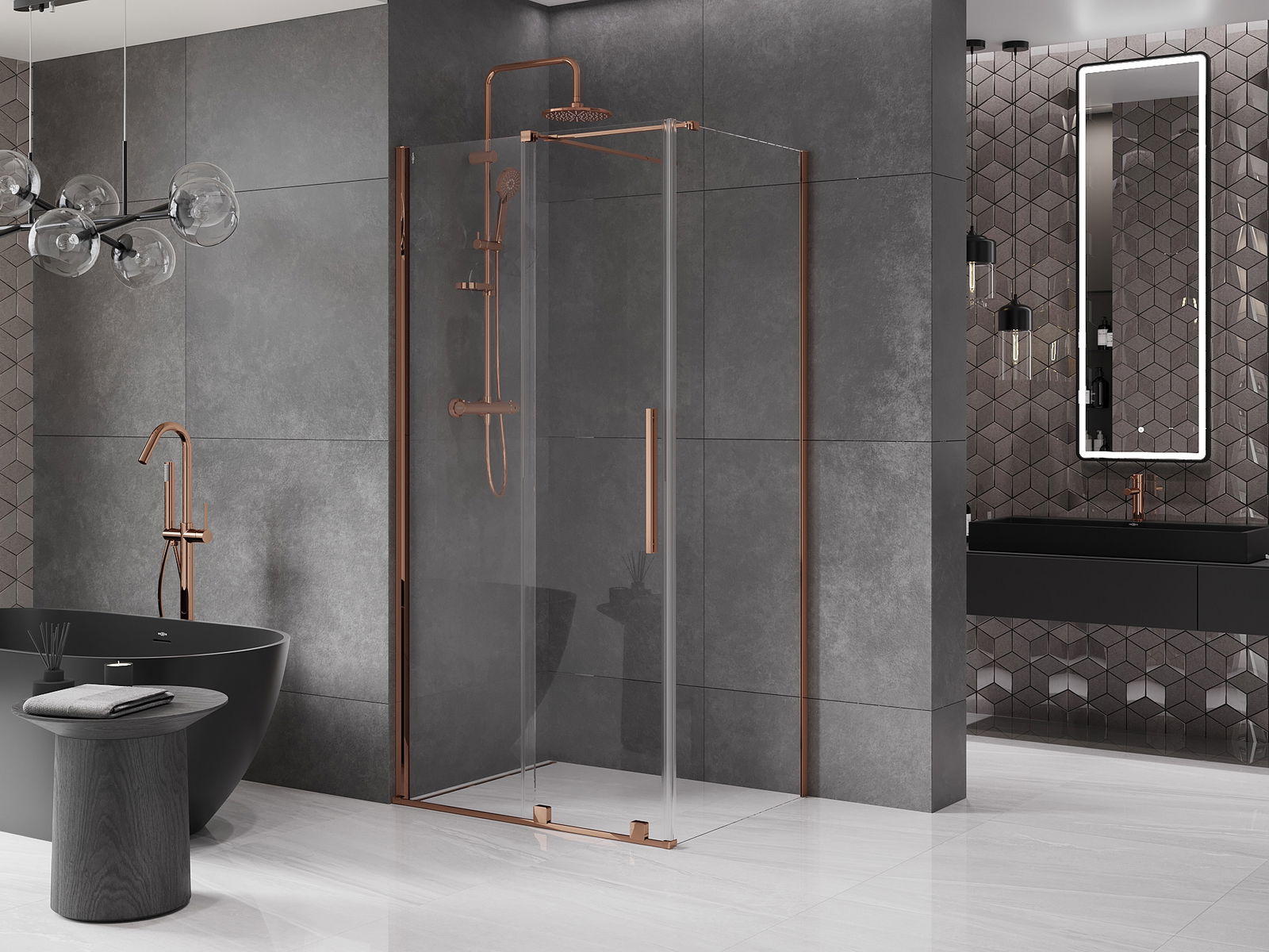 Het handige en comfortabele handvat is gemaakt van roestvrij staal. De modieuze vorm in combinatie met de afwerking die is afgestemd op de kleur van de profielen geeft het geheel een moderne en stijlvolle uitstraling, en benadrukt de esthetiek van elke badkamer.