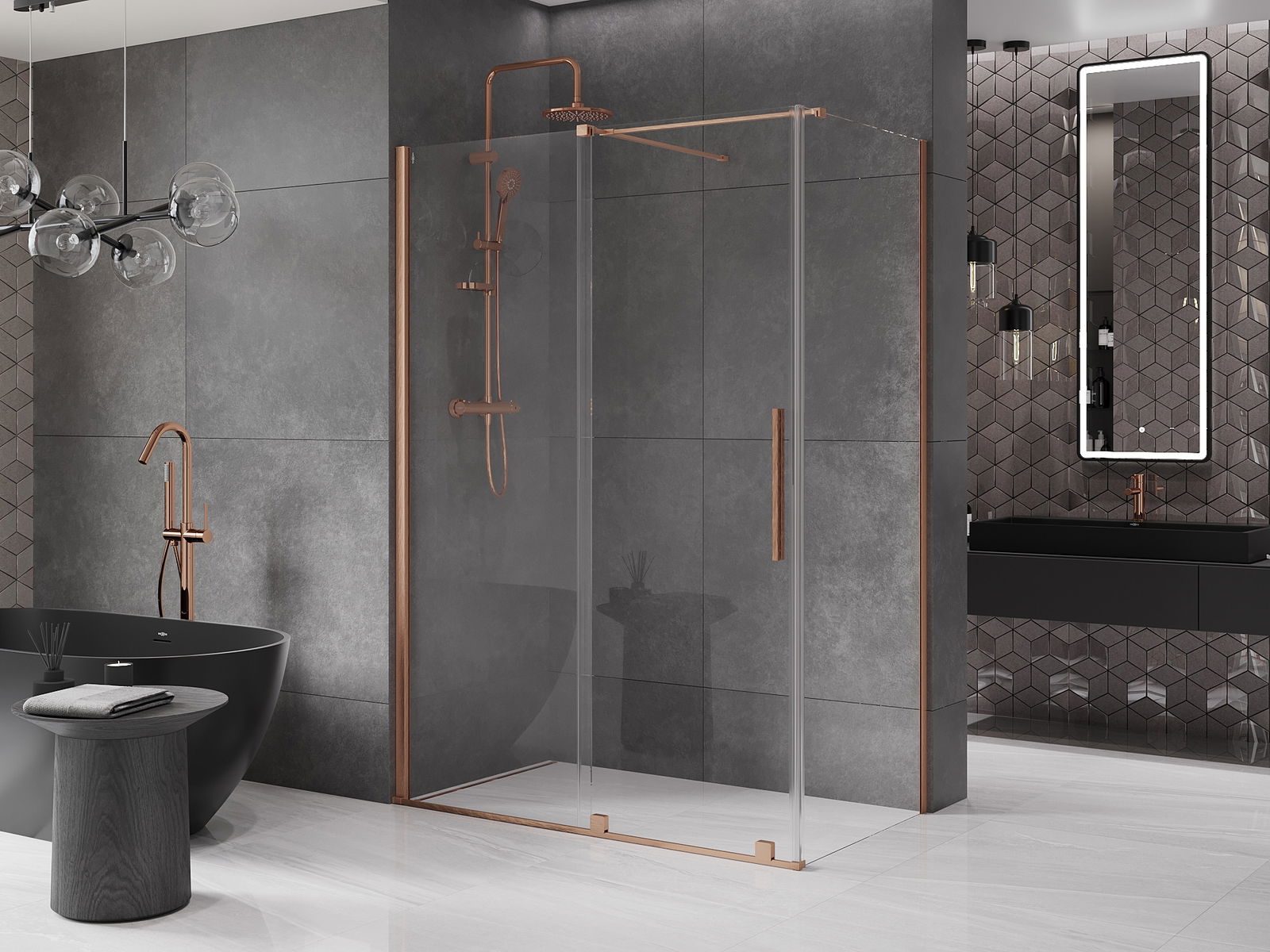 Het handige en comfortabele handvat is gemaakt van roestvrij staal. De modieuze vorm in combinatie met de afwerking die is afgestemd op de kleur van de profielen geeft het geheel een moderne en stijlvolle uitstraling, en benadrukt de esthetiek van elke badkamer.