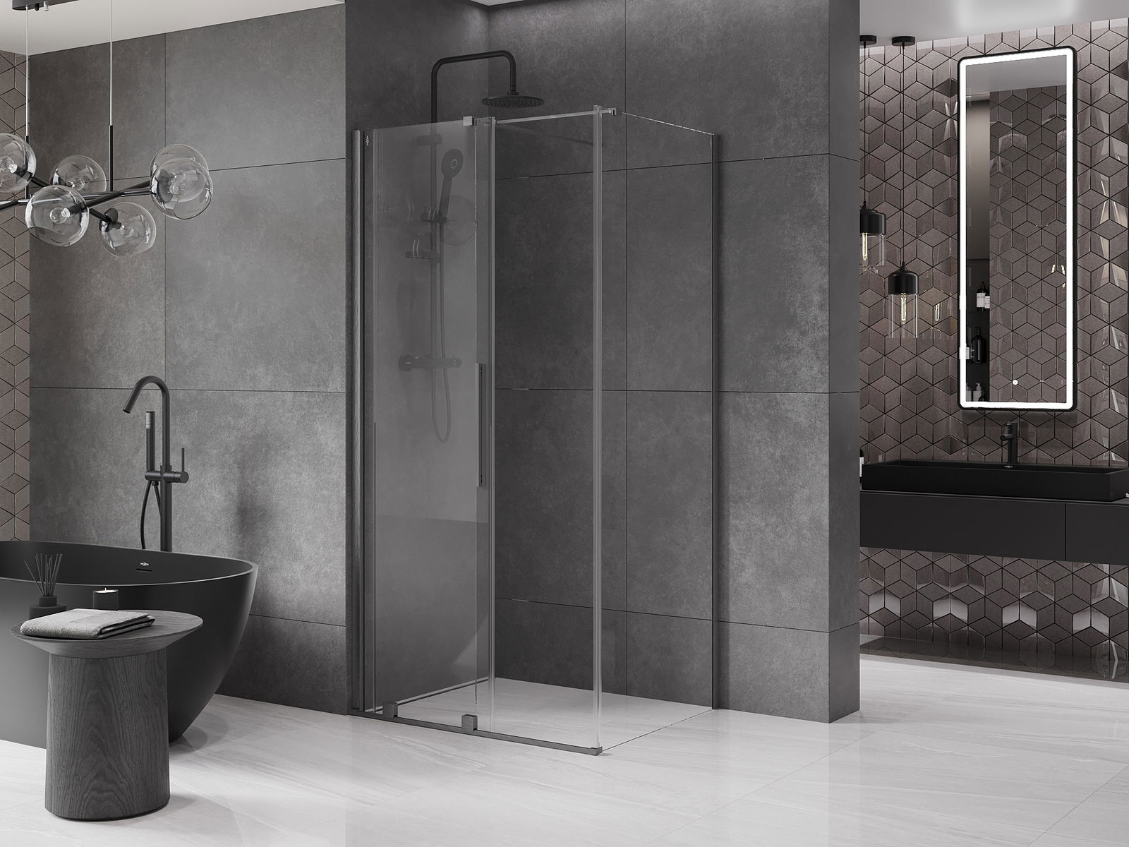 Het handige en comfortabele handvat is gemaakt van roestvrij staal. De modieuze vorm in combinatie met de afwerking die is afgestemd op de kleur van de profielen geeft het geheel een moderne en stijlvolle uitstraling, en benadrukt de esthetiek van elke badkamer.