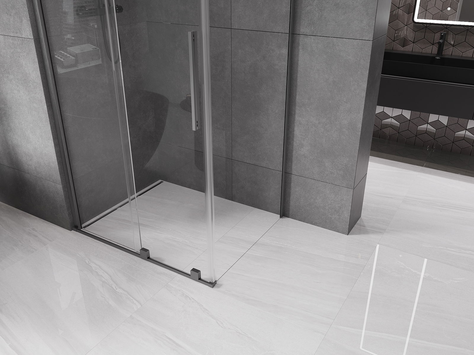 Het handige en comfortabele handvat is gemaakt van roestvrij staal. De modieuze vorm in combinatie met de afwerking die is afgestemd op de kleur van de profielen geeft het geheel een moderne en stijlvolle uitstraling, en benadrukt de esthetiek van elke badkamer.