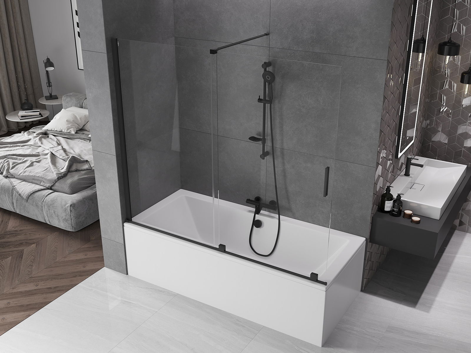 Mexen Velar badscherm voor badkuip 2-delig schuifbaar 180 x 150 cm, transparant, zwart - 896-180-000-01-70