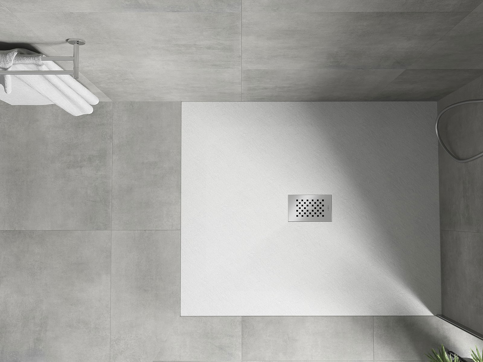 Het oppervlak van de douchebak doet met zijn structuur denken aan steen. Het vormt een uitzonderlijke combinatie van een natuurlijke uitstraling met een moderne interieurinrichting. Het voegt karakter toe, benadrukt de esthetiek en elegantie van de badkamerinrichting en verrast met zijn vorm.
