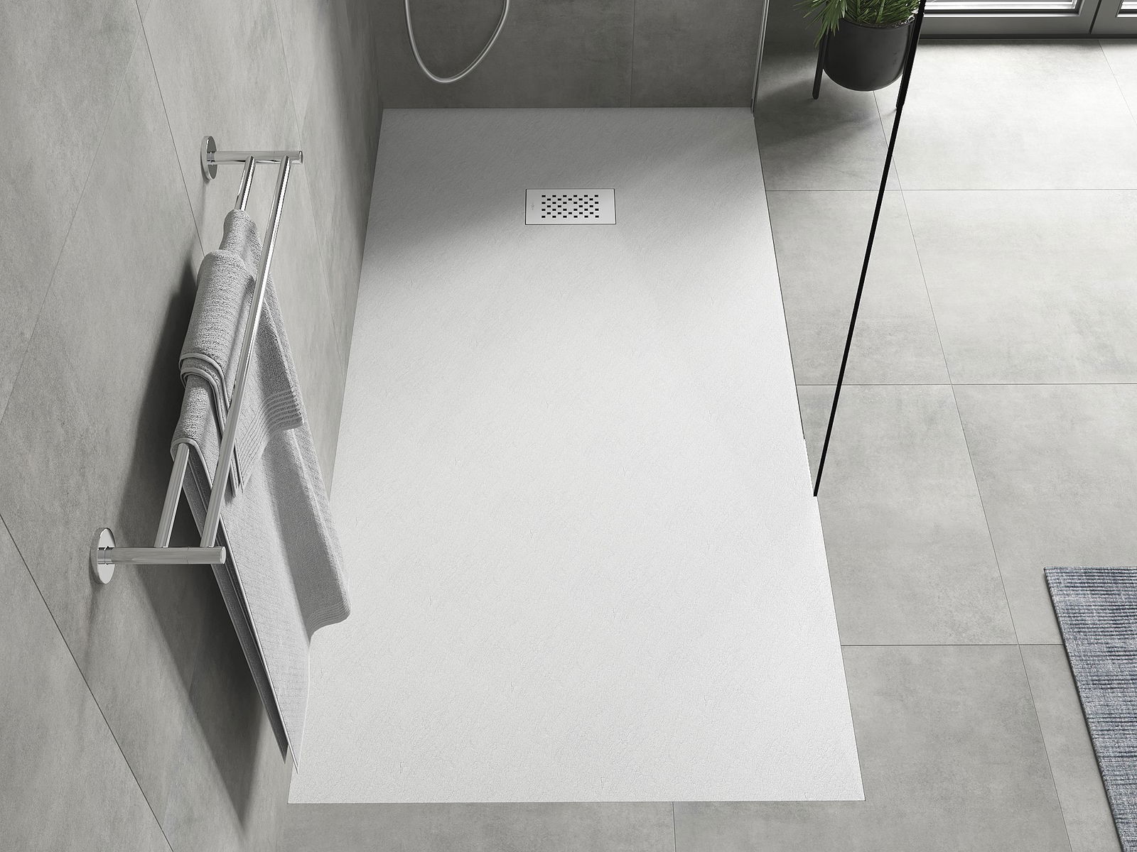 Het oppervlak van de douchebak doet met zijn structuur denken aan steen. Het vormt een uitzonderlijke combinatie van een natuurlijke uitstraling met een moderne interieurinrichting. Het voegt karakter toe, benadrukt de esthetiek en elegantie van de badkamerinrichting en verrast met zijn vorm.
