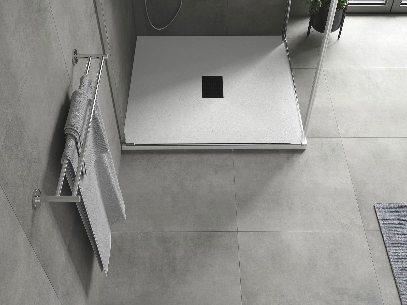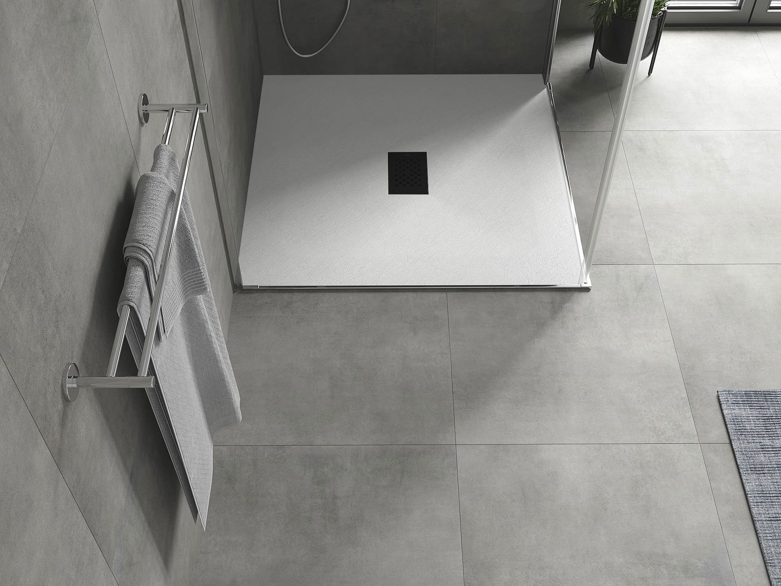 Het oppervlak van de douchebak doet met zijn structuur denken aan steen. Het vormt een uitzonderlijke combinatie van een natuurlijke uitstraling met een moderne interieurinrichting. Het voegt karakter toe, benadrukt de esthetiek en elegantie van de badkamerinrichting en verrast met zijn vorm.