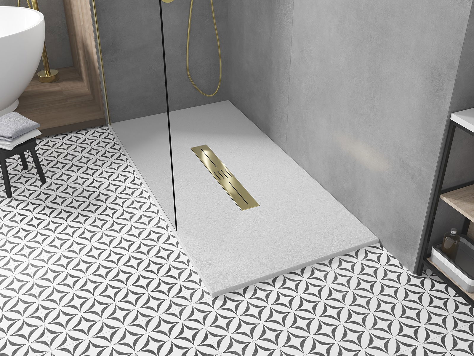 De douchebak heeft een lage drempel, wat het in- en uitstappen uit de douche vergemakkelijkt. Het voegt een uitzonderlijke en tijdloze afwerking toe aan de ruimte, waardoor de badkamer een comfortabele en esthetische plek wordt voor dagelijkse ontspanning.