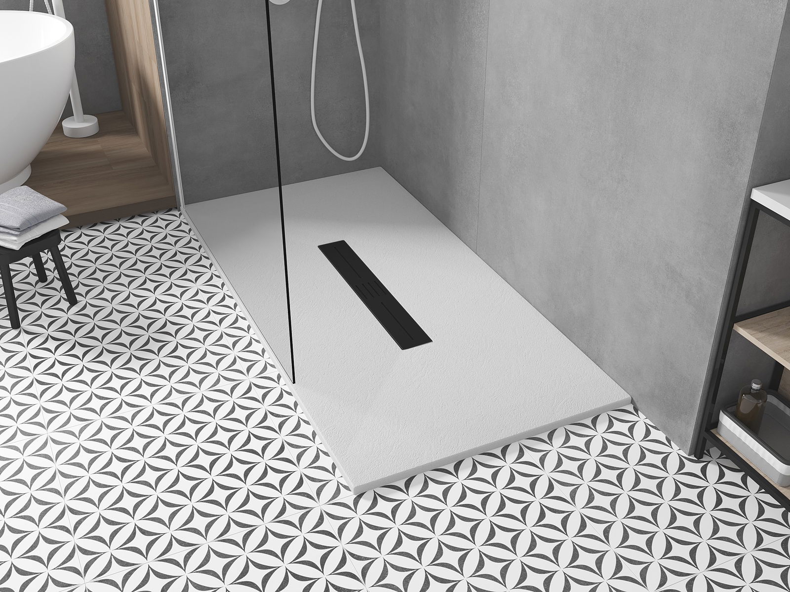 Het oppervlak van de douchebak doet met zijn structuur denken aan steen. Het vormt een uitzonderlijke combinatie van een natuurlijke uitstraling met een moderne interieurinrichting. Het voegt karakter toe, benadrukt de esthetiek en elegantie van de badkamerinrichting en verrast met zijn vorm.