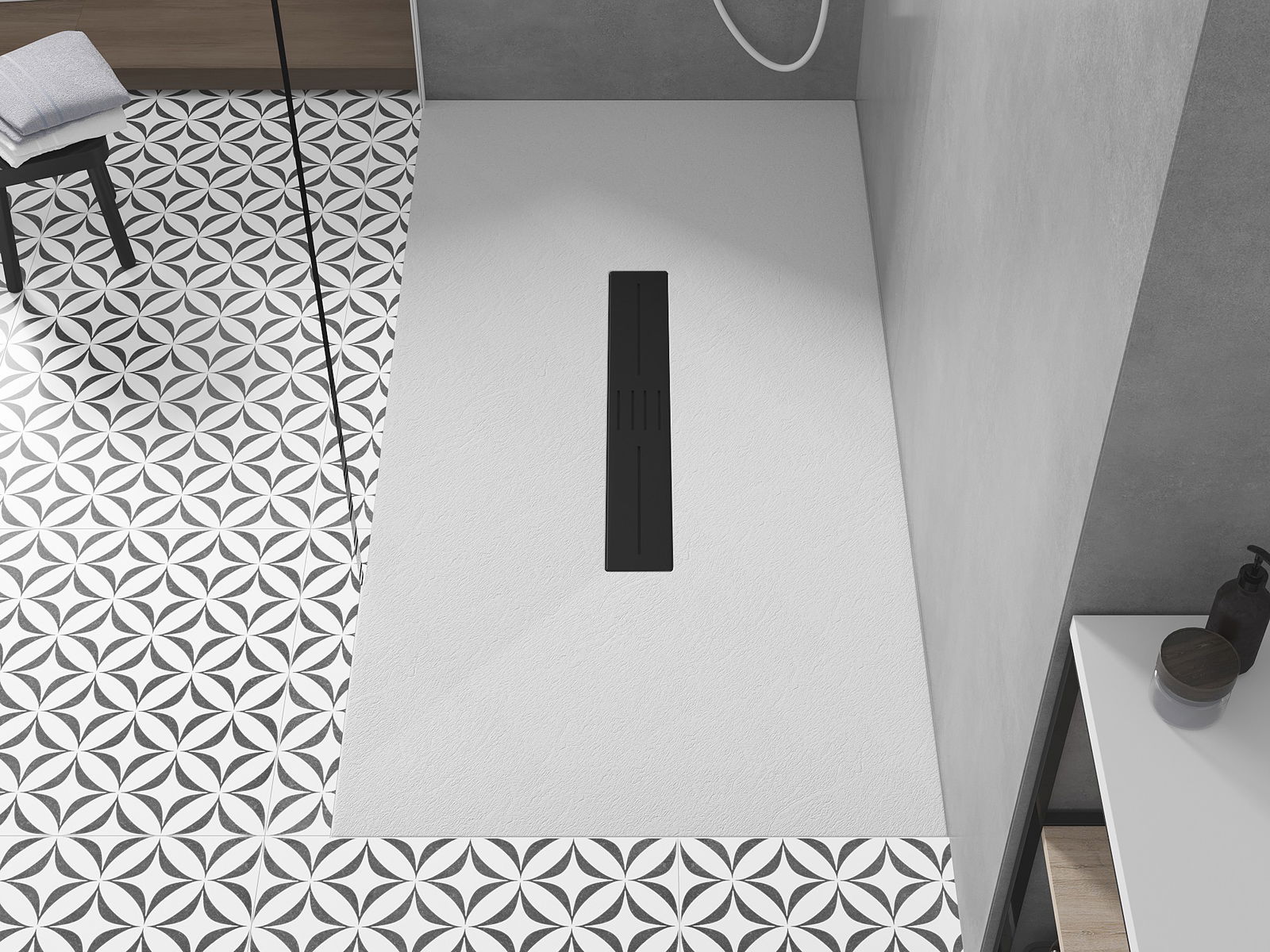 Het oppervlak van de douchebak doet met zijn structuur denken aan steen. Het vormt een uitzonderlijke combinatie van een natuurlijke uitstraling met een moderne interieurinrichting. Het voegt karakter toe, benadrukt de esthetiek en elegantie van de badkamerinrichting en verrast met zijn vorm.