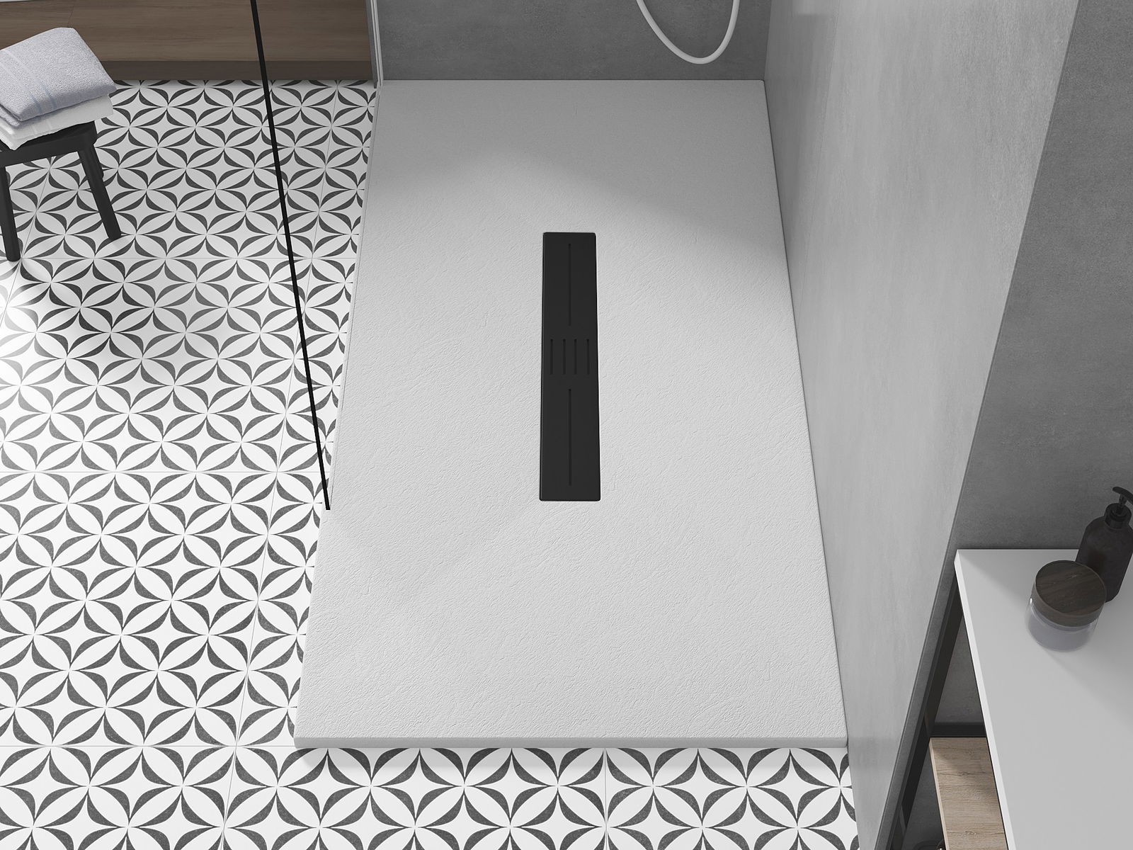 Het oppervlak van de douchebak doet met zijn structuur denken aan steen. Het vormt een uitzonderlijke combinatie van een natuurlijke uitstraling met een moderne interieurinrichting. Het voegt karakter toe, benadrukt de esthetiek en elegantie van de badkamerinrichting en verrast met zijn vorm.