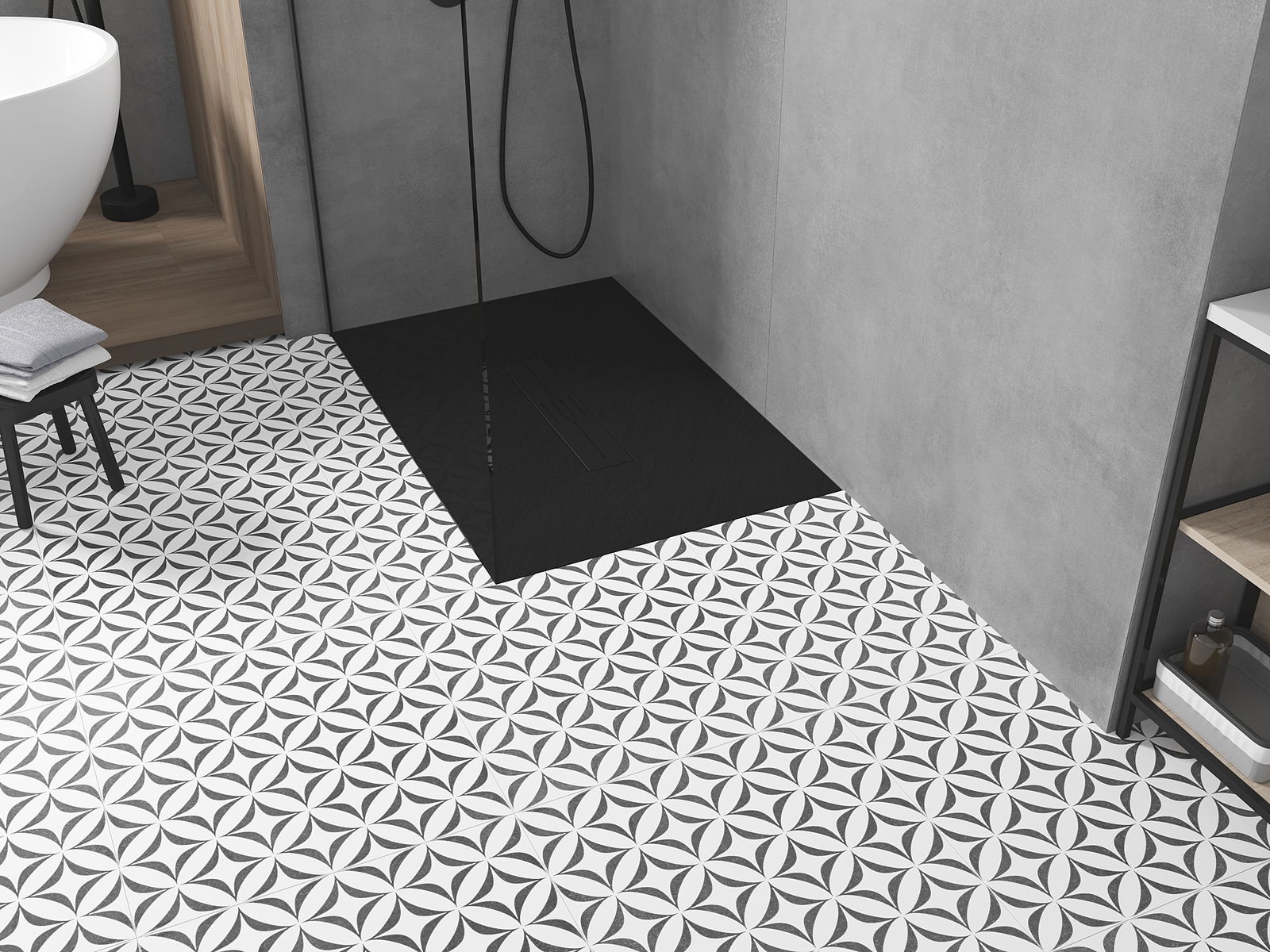 De douchebak heeft een lage drempel, wat het in- en uitstappen uit de douche vergemakkelijkt. Het voegt een uitzonderlijke en tijdloze afwerking toe aan de ruimte, waardoor de badkamer een comfortabele en esthetische plek wordt voor dagelijkse ontspanning.
