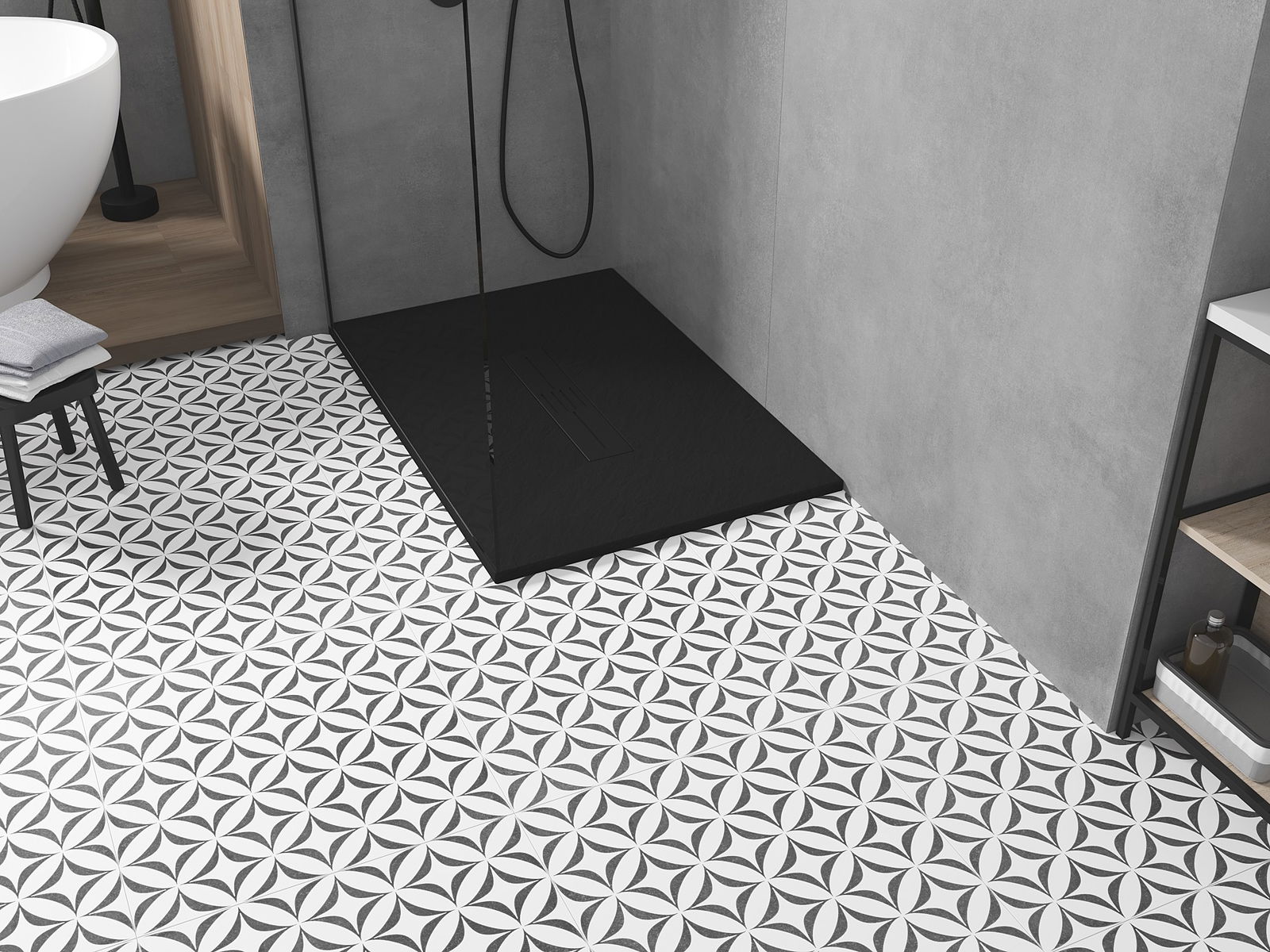 De douchebak heeft een lage drempel, wat het in- en uitstappen uit de douche vergemakkelijkt. Het voegt een uitzonderlijke en tijdloze afwerking toe aan de ruimte, waardoor de badkamer een comfortabele en esthetische plek wordt voor dagelijkse ontspanning.