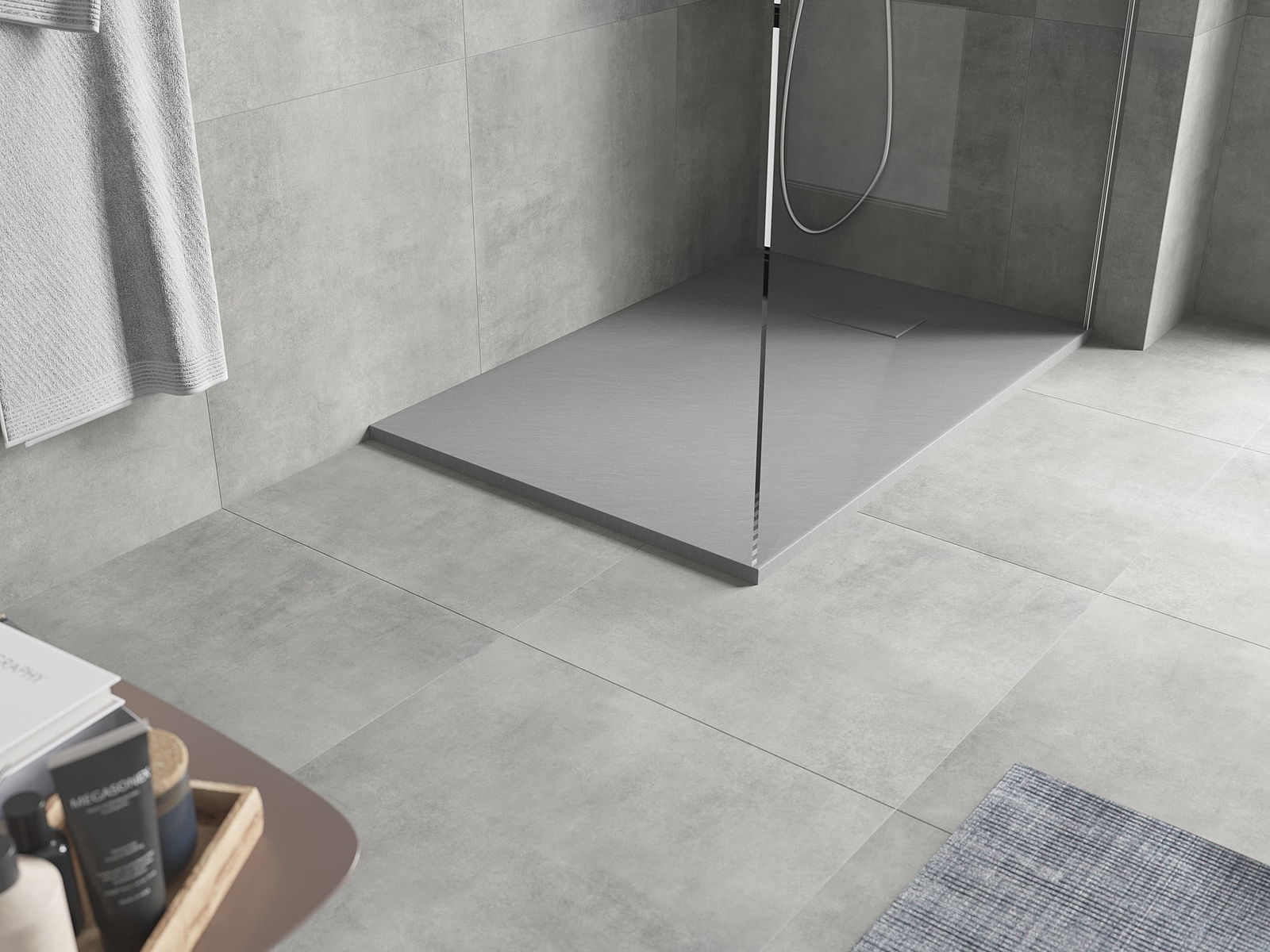 Het oppervlak van de douchebak doet met zijn structuur denken aan steen. Het vormt een uitzonderlijke combinatie van een natuurlijke uitstraling met een moderne interieurinrichting. Het voegt karakter toe, benadrukt de esthetiek en elegantie van de badkamerinrichting en verrast met zijn vorm.