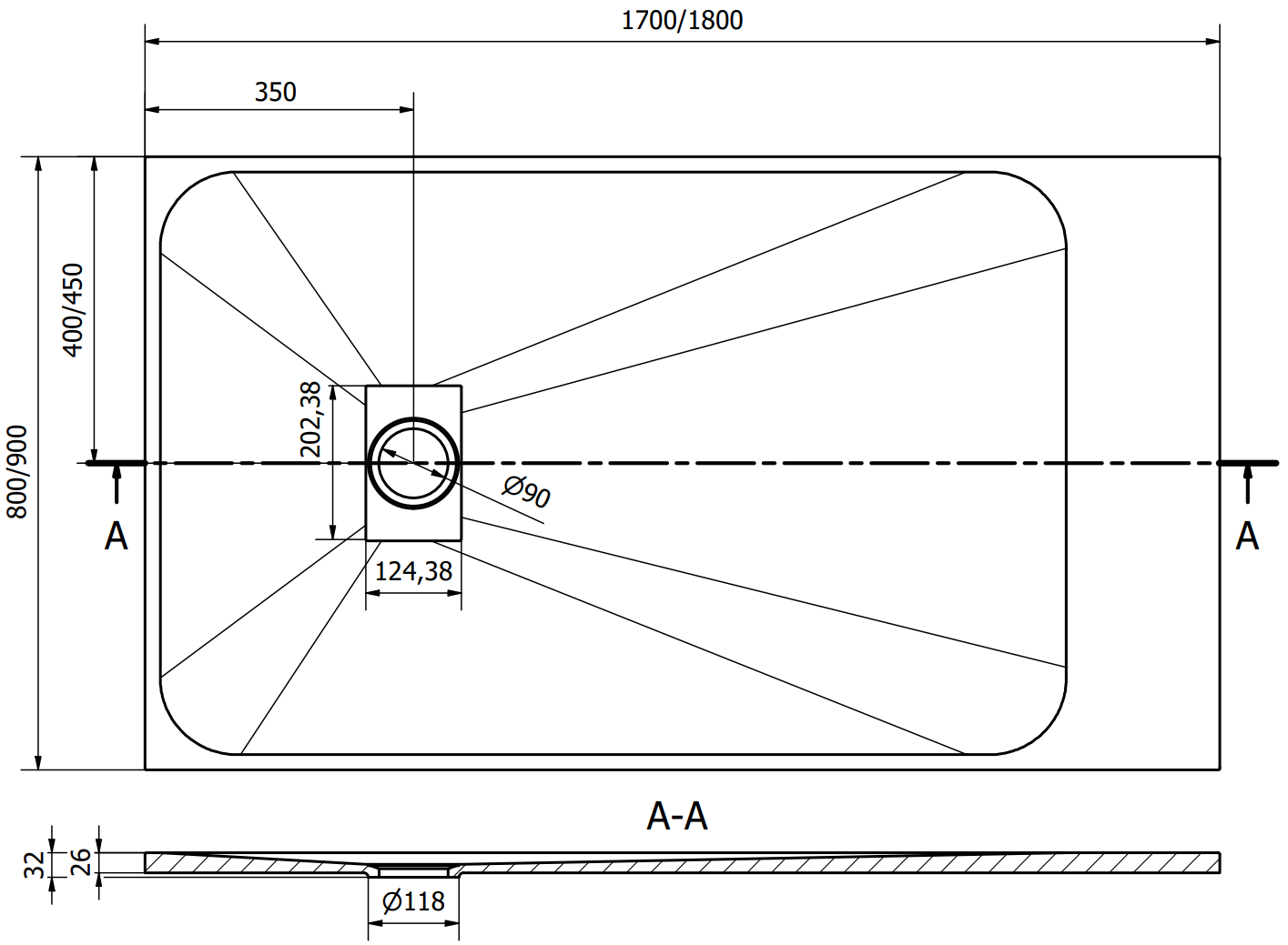 De douchebak is zo ontworpen dat het water vrij kan weglopen in de richting van de afvoer. Het zorgt voor een snelle en efficiënte afvoer van water van het oppervlak van de douchebak, waardoor het ontstaan van plassen en het overstromen van de badkamer wordt voorkomen.