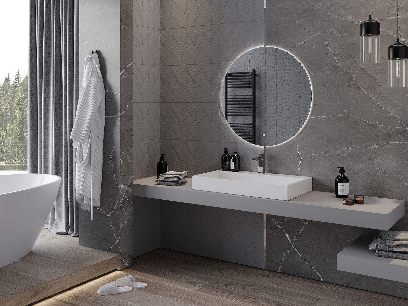 LED-verlichting bij de spiegel is een praktisch element dat het dagelijkse verzorgen vergemakkelijkt, dankzij de mogelijkheid om het gezicht perfect te verlichten. De verlichting geeft de badkamer een moderne afwerking en benadrukt de elegante inrichting ervan.