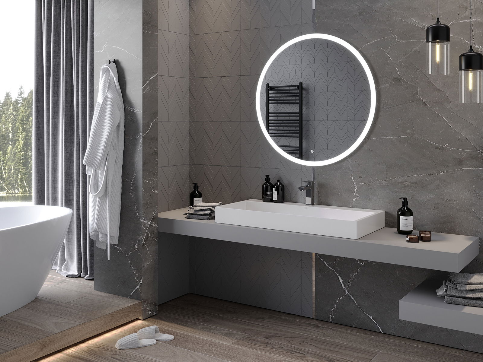 LED-verlichting bij de spiegel is een praktisch element dat het dagelijkse verzorgen vergemakkelijkt, dankzij de mogelijkheid om het gezicht perfect te verlichten. De verlichting geeft de badkamer een moderne afwerking en benadrukt de elegante inrichting ervan.