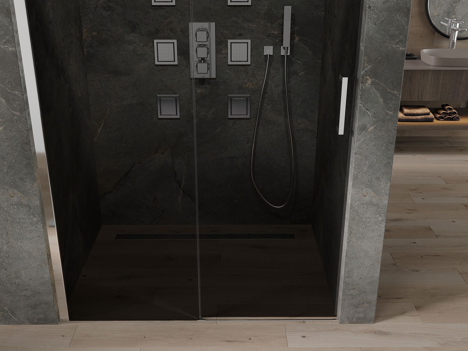 Schuifdeuren bewegen op speciale rails en hebben geen extra ruimte nodig om te openen, waardoor ze geschikt zijn voor kleinere badkamers. Dankzij dubbele metalen wielen is hun beweging soepel.