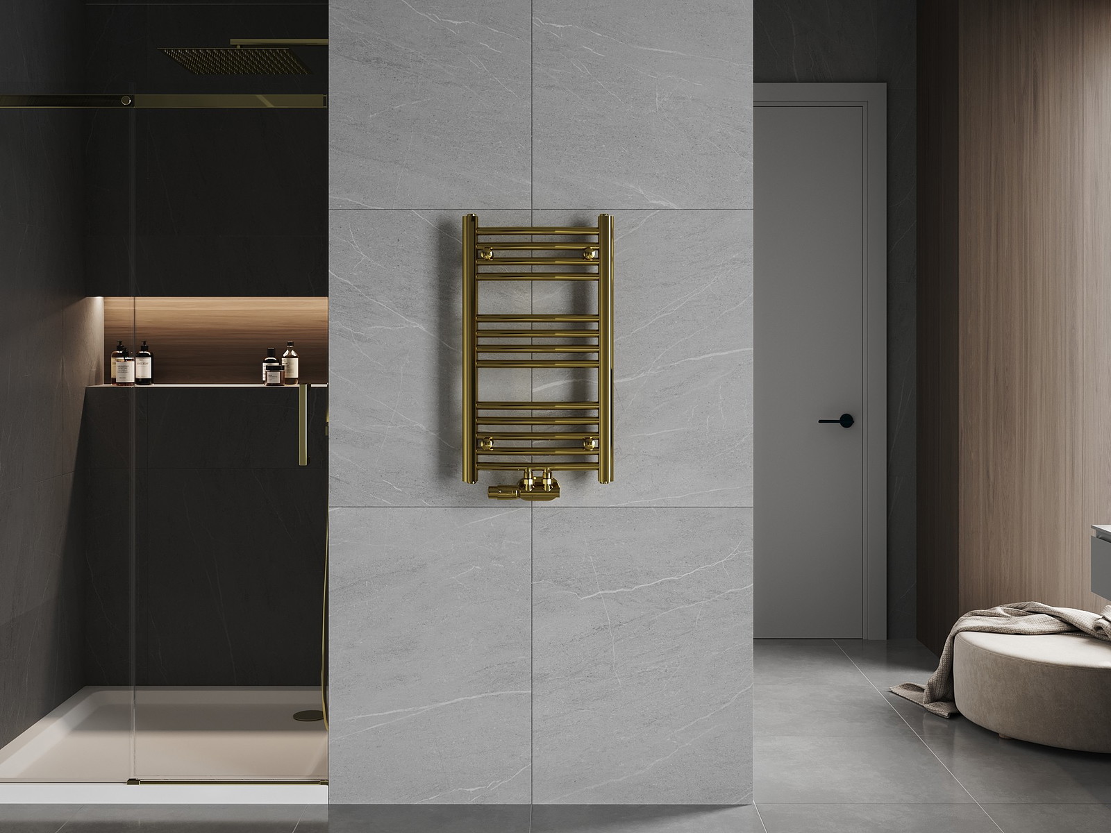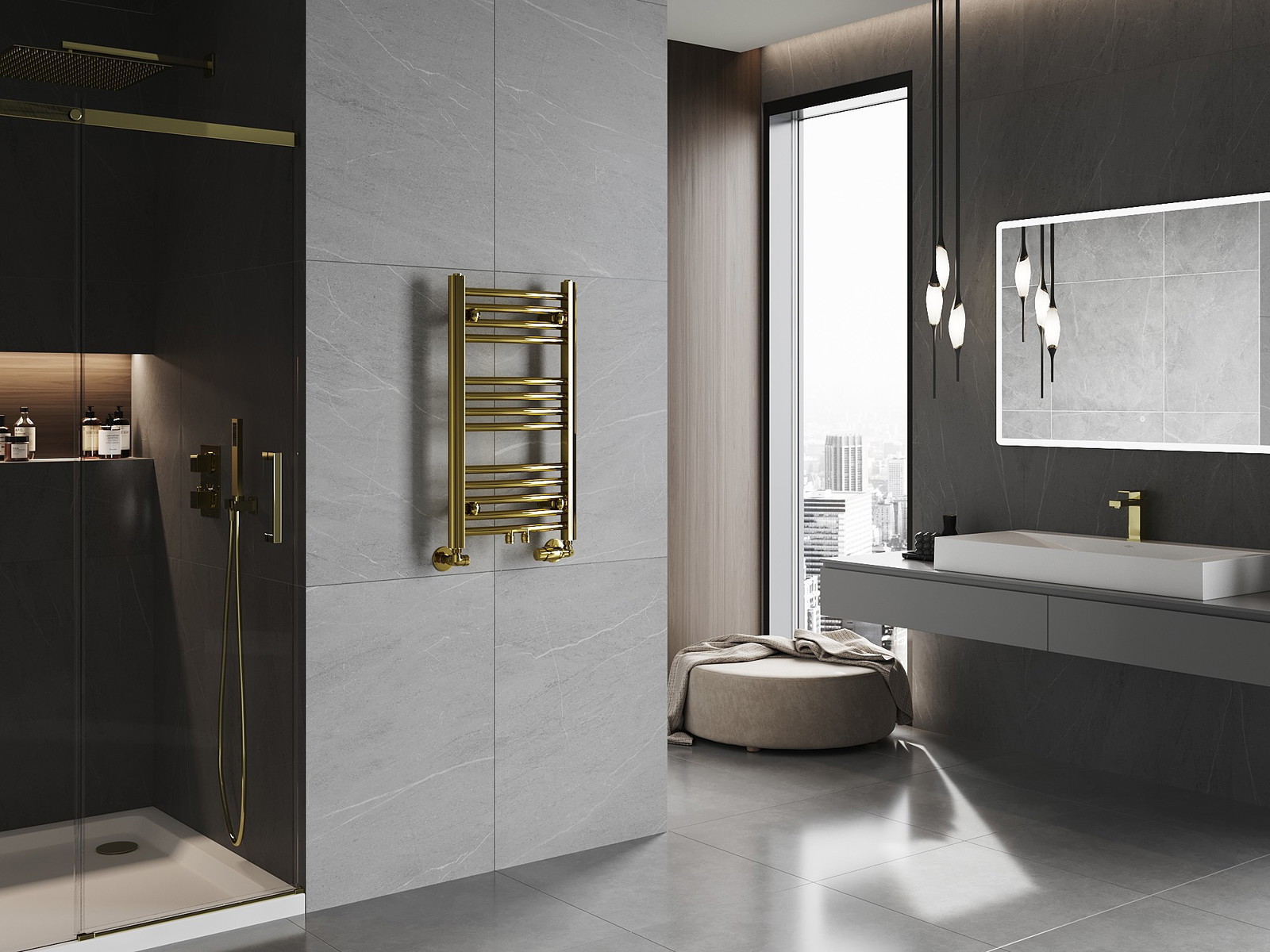 Mexen Ares is een elegante badkamerradiator met afmetingen van 700 x 400 mm, die een verwarmingsvermogen van 189 W biedt en opvalt door zijn gouden kleur. Gemaakt van staal, weegt 4,13 kg. Dankzij de corrosiebestendige laklaag en de brandreactie van klasse A1 is het product niet alleen esthetisch, maar ook veilig. Biedt de mogelijkheid tot installatie van een verwarmingselement en diverse aansluitingen maken de installatie flexibel. Inclusief ophangingen, montageset, afsluitdoppen en ontluchter.