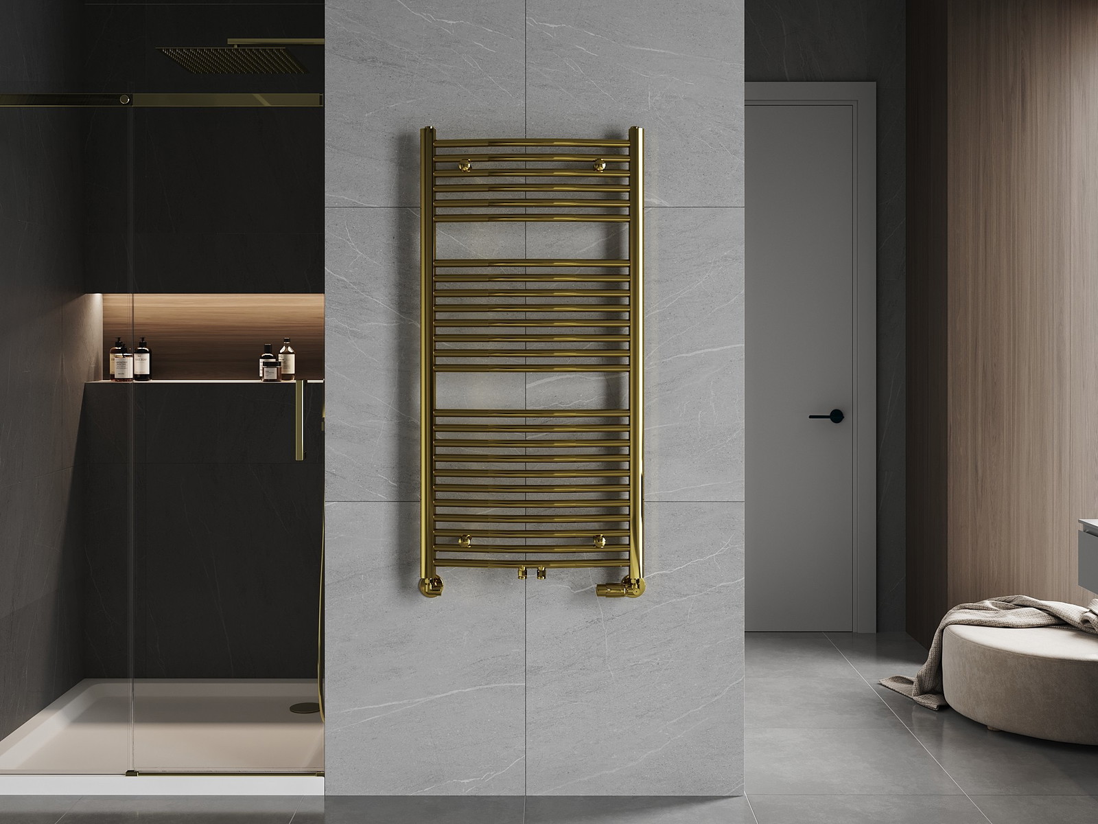 Mexen Ares is een elegante badkamerradiator in gouden kleur, ideaal voor moderne interieurs. De afmetingen zijn 1200 mm hoogte en 600 mm breedte, en dankzij het vermogen van 490 W biedt het comfortabele verwarming. Dankzij de onderste of middelste aansluitafstand (55 cm / 5 cm) en de mogelijkheid om een heater te installeren, is Mexen Ares uiterst flexibel in installatie. Gemaakt van staal, met een duurzame coating die bestand is tegen corrosie, is het niet alleen functioneel maar ook stijlvol. In de set vind je alle benodigde accessoires voor de montage.