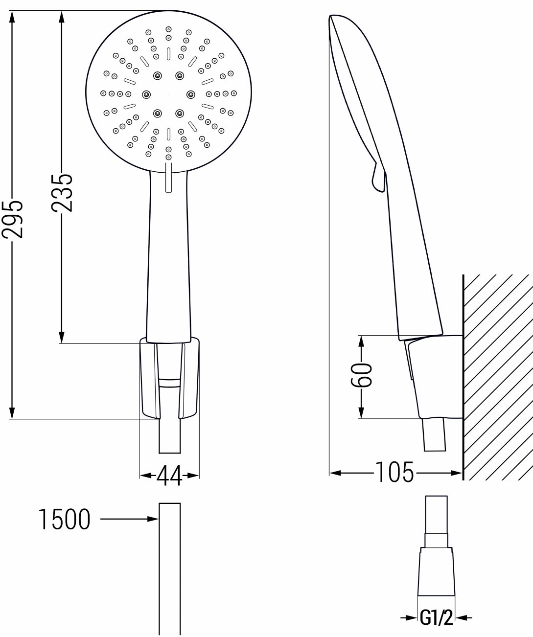 De handdouche heeft drie sproeistanden, te bedienen met een schakelaar. Hij biedt volledige flexibiliteit en de mogelijkheid om zich aan te passen aan de behoeften van de gebruiker, met een zachtere of een sterkere, meer geconcentreerde waterstraal.