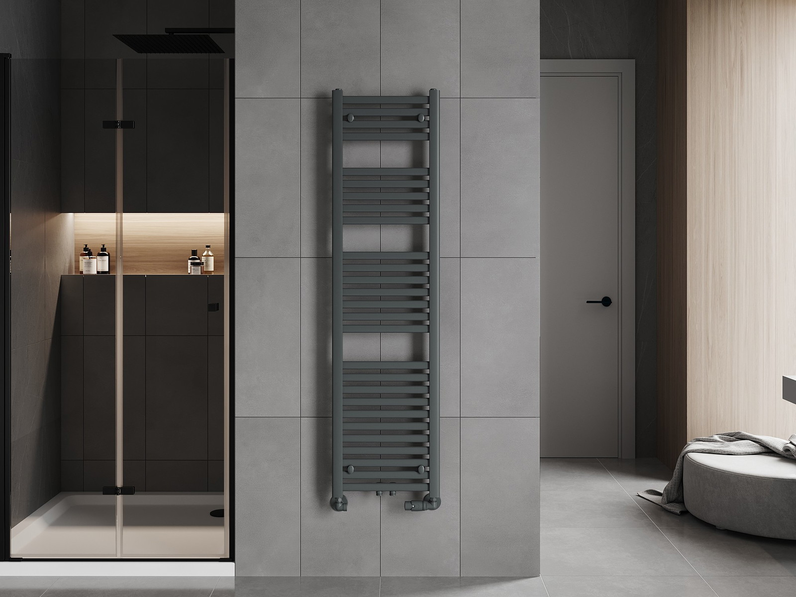 De Mexen Hades badkamerradiator combineert perfect modern design met functionaliteit. Deze stalen radiator met afmetingen 1500 x 400 mm en een minimale diepte van 30 mm is perfect geschikt voor badkamers van elke grootte. De antracietkleur RAL 7016 voegt elegantie toe, terwijl het hoge verwarmingsvermogen van 583 W voor thermisch comfort zorgt. Bovendien is dit model dankzij de duurzame laklaag bestand tegen corrosie en kan het verwarmingselement gemakkelijk worden geïnstalleerd. De set bevat ophangbeugels en andere benodigde accessoires.