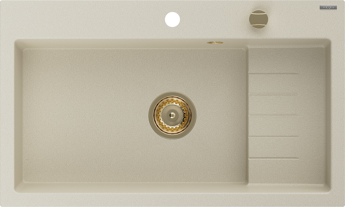 De spoelbak heeft een voorgesneden gat met een diameter van 35 mm voor eenvoudige verwijdering. Dit gat kan bijvoorbeeld worden gebruikt om een vloeistofdispenser te installeren, waardoor plastic flessen in de keuken overbodig zijn en een elegante afwerking ontstaat.