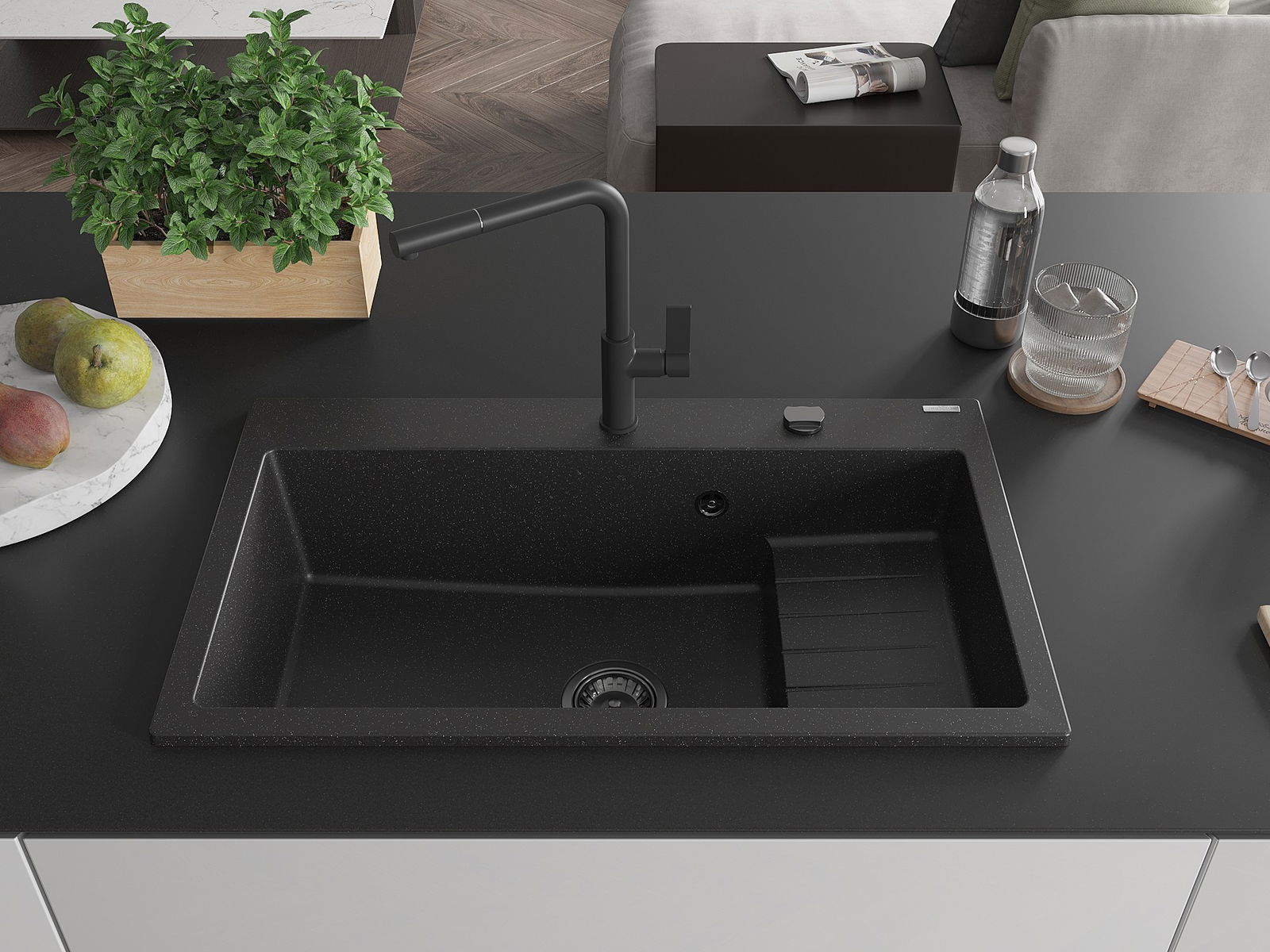 De gootsteen is gemaakt van hoogwaardig graniet. Het vormt een elegante en vooral praktische aanvulling op elke keuken, ongeacht de stijl ervan. De hoge kwaliteit en duurzaamheid van graniet garanderen jarenlang gebruik.