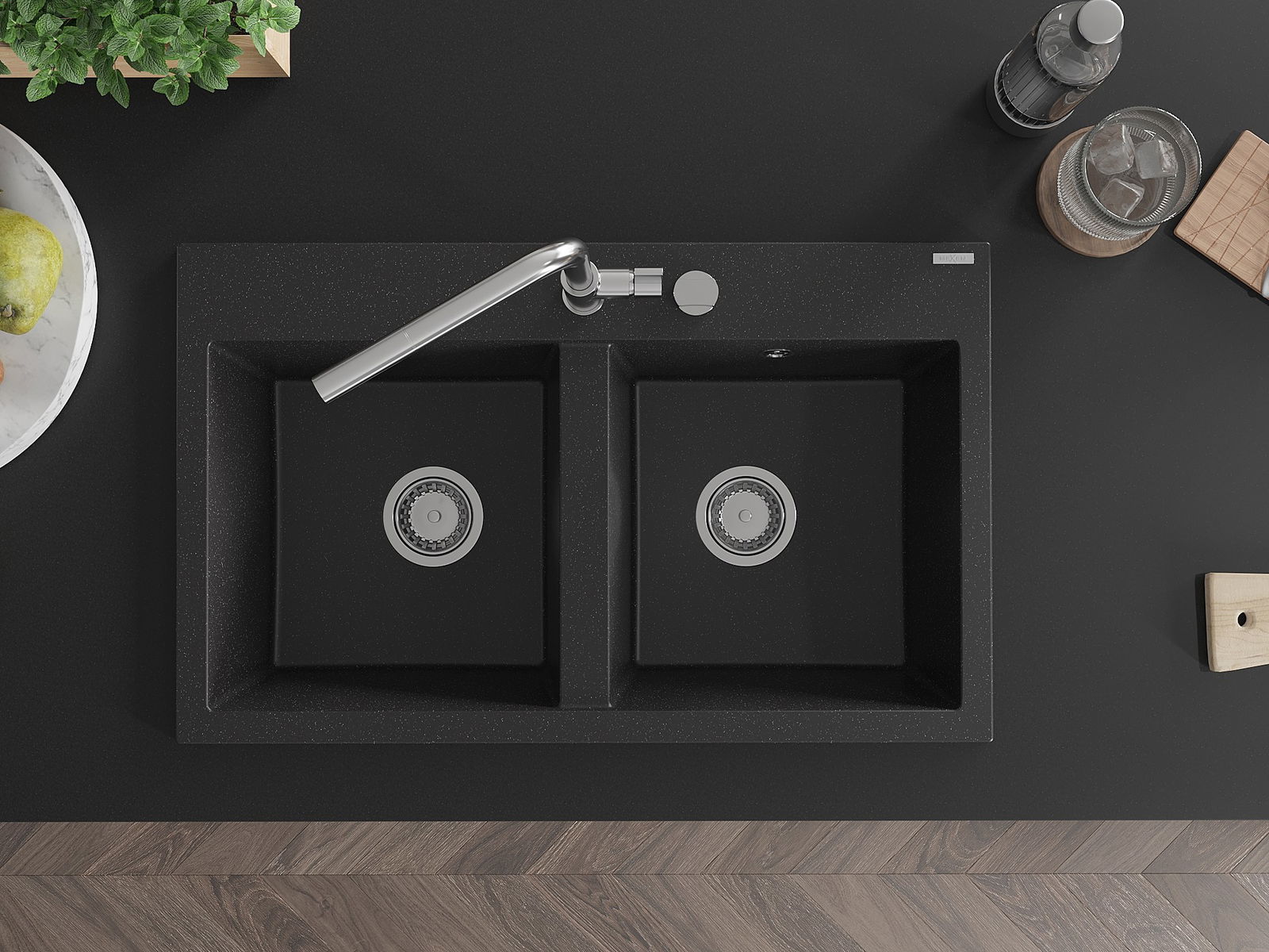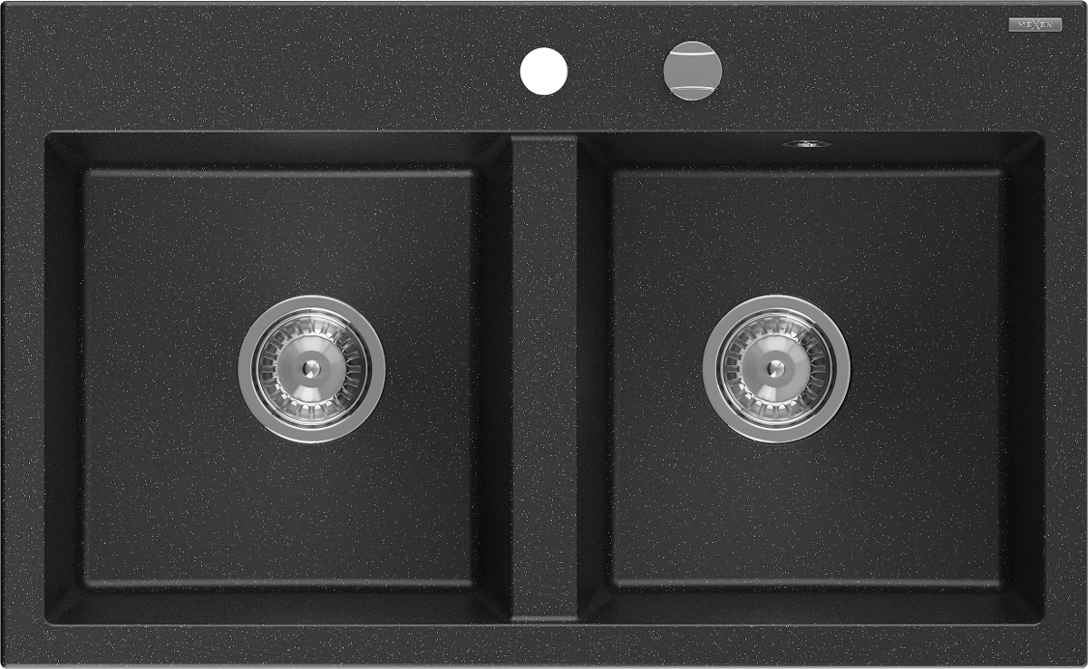 Mexen Hektor 2-komorige granieten gootsteen 800 x 480 mm, zwart/zilver metallic, chromen sifon - 6521802000-73