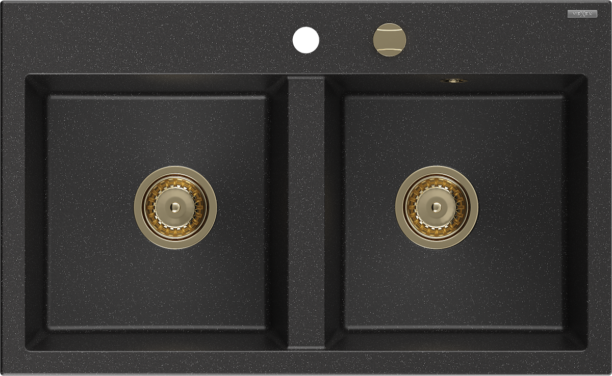 Mexen Hektor granieten gootsteen 2-kamer 800 x 480 mm, zwart/zilveren metallic, gouden sifon - 6521802000-73-G