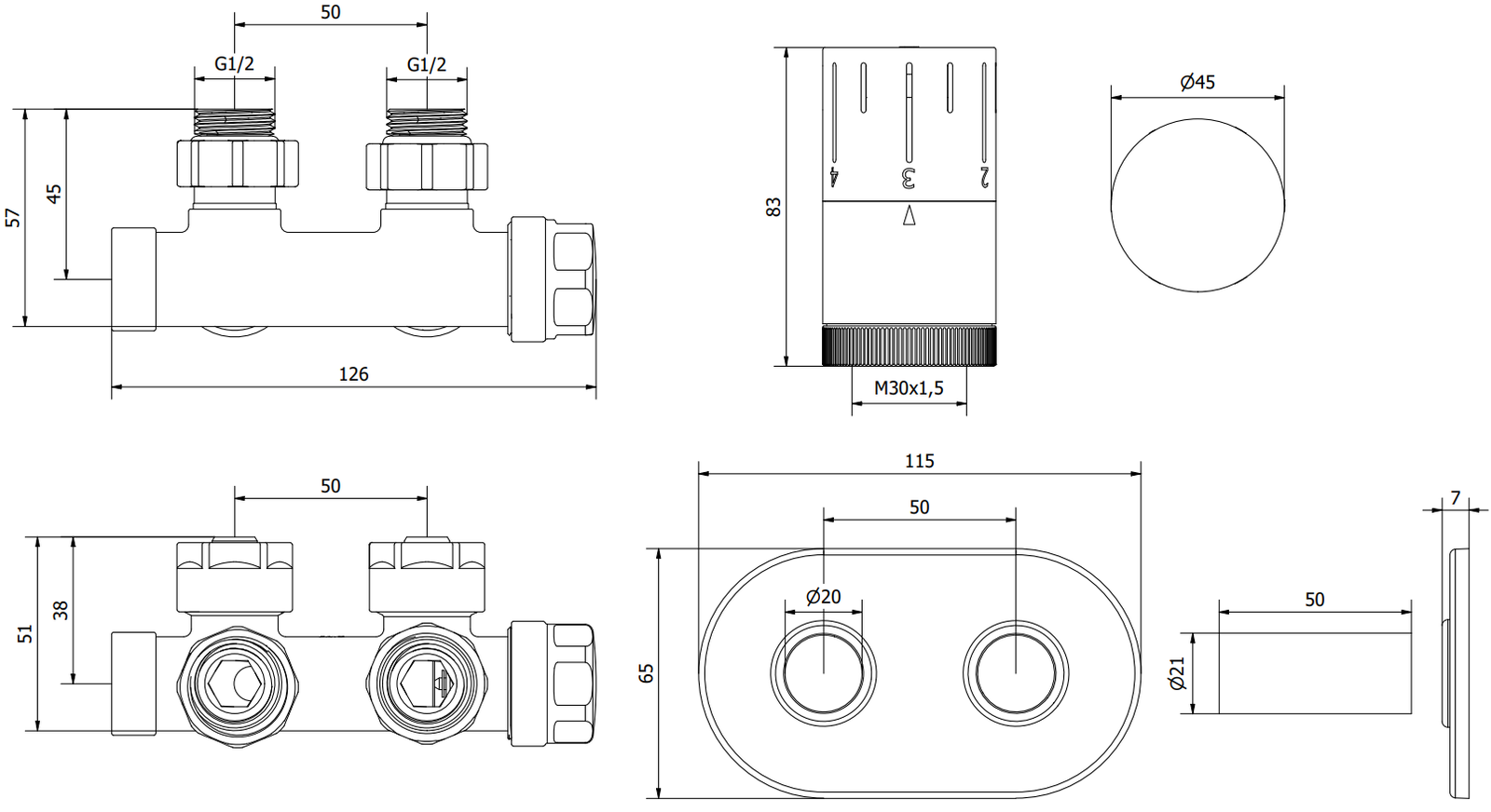 Afstand tussen de gaten voor radiatoraansluitingen: 50 mm