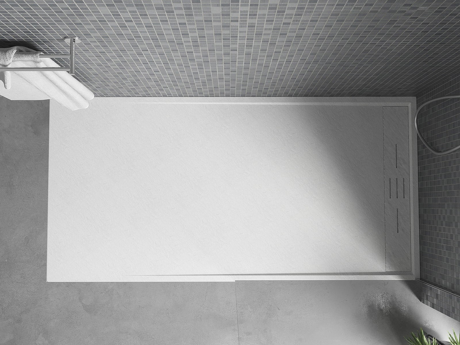 De douchebak is zo ontworpen dat het water vrij kan weglopen in de richting van de afvoer. Het zorgt voor een snelle en efficiënte afvoer van water van het oppervlak van de douchebak, waardoor het ontstaan van plassen en het overstromen van de badkamer wordt voorkomen.