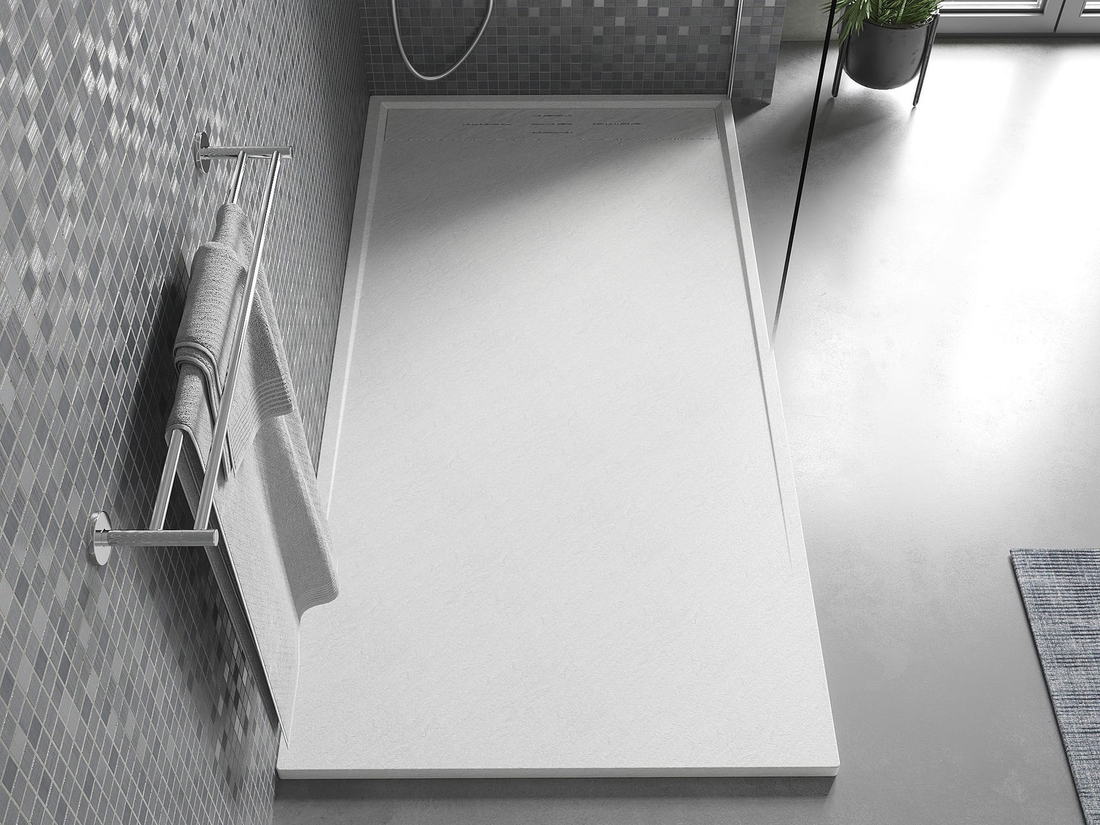 Het oppervlak van de douchebak doet met zijn structuur denken aan steen. Het vormt een uitzonderlijke combinatie van een natuurlijke uitstraling met een moderne interieurinrichting. Het voegt karakter toe, benadrukt de esthetiek en elegantie van de badkamerinrichting en verrast met zijn vorm.