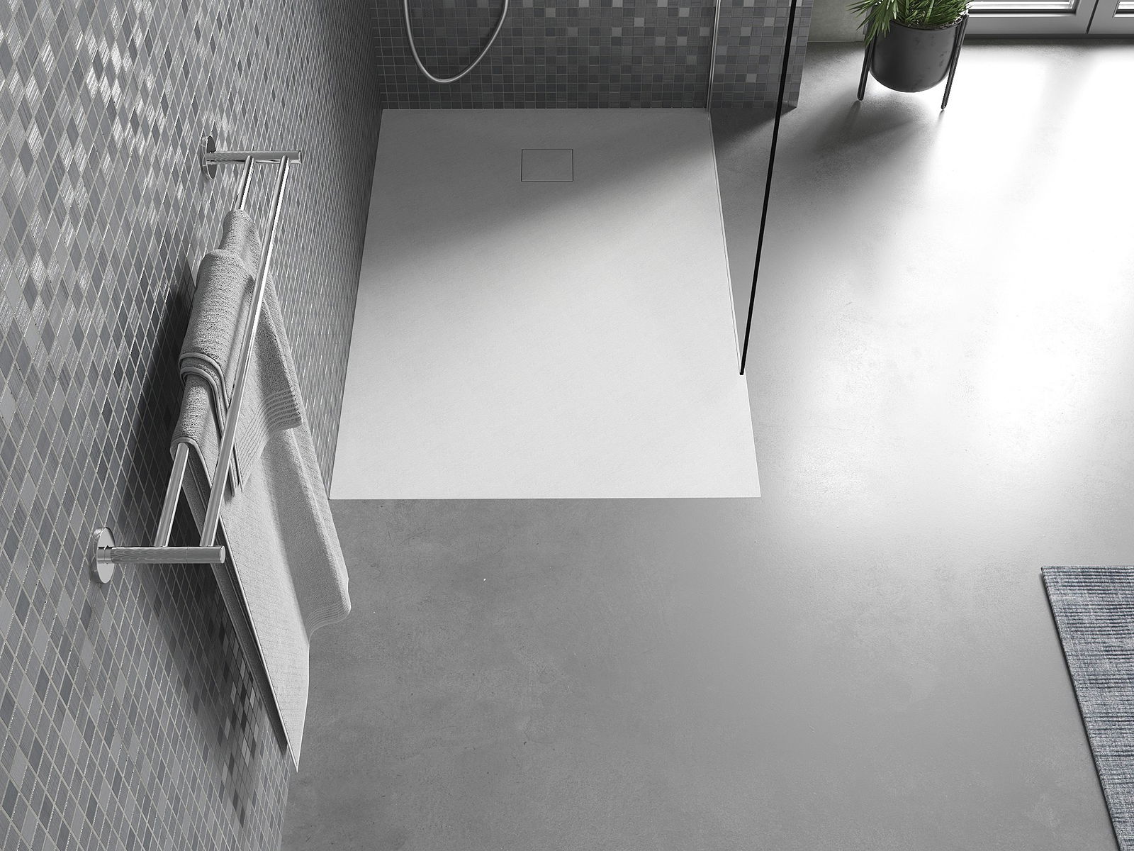 Het oppervlak van de douchebak doet met zijn structuur denken aan steen. Het vormt een uitzonderlijke combinatie van een natuurlijke uitstraling met een moderne interieurinrichting. Het voegt karakter toe, benadrukt de esthetiek en elegantie van de badkamerinrichting en verrast met zijn vorm.