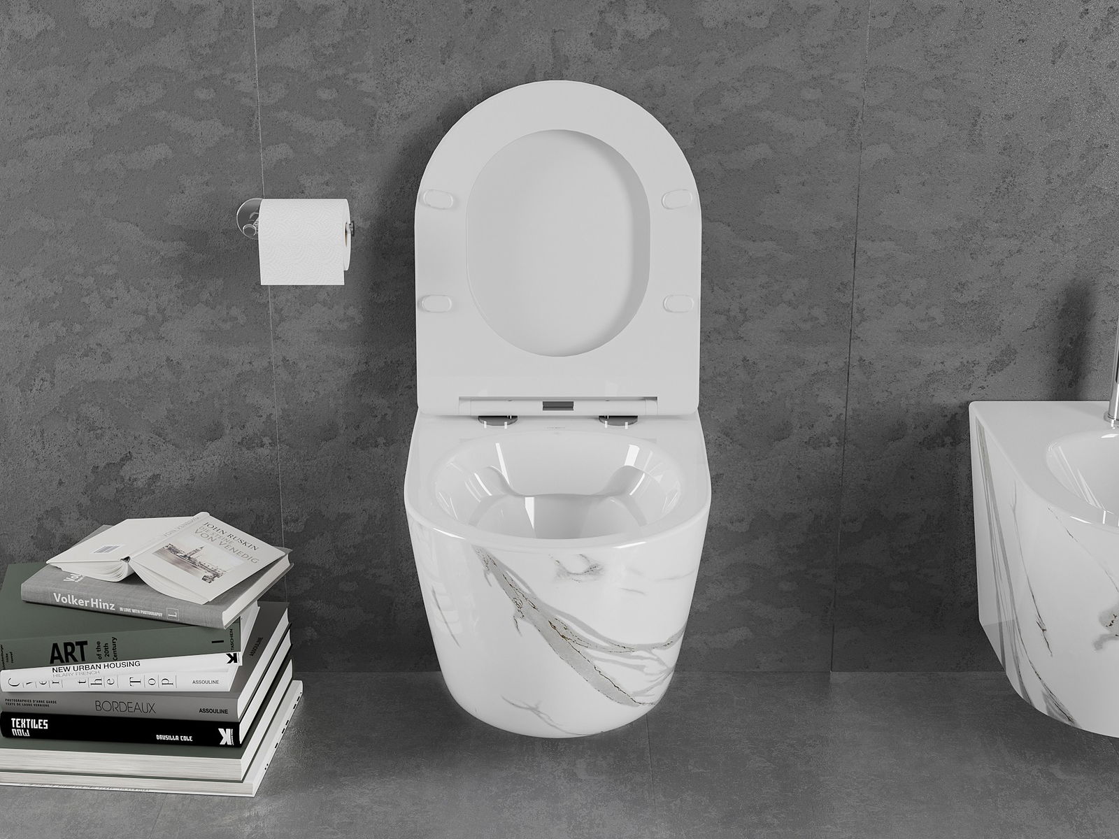 De zelfsluitende toiletbril is uitgerust met een speciaal systeem dat het snelle en plotselinge vallen ervan remt. Het systeem elimineert effectief het probleem van klapperen met de bril en minimaliseert geluid, waardoor een soepele en stille sluiting van het toilet wordt gegarandeerd.