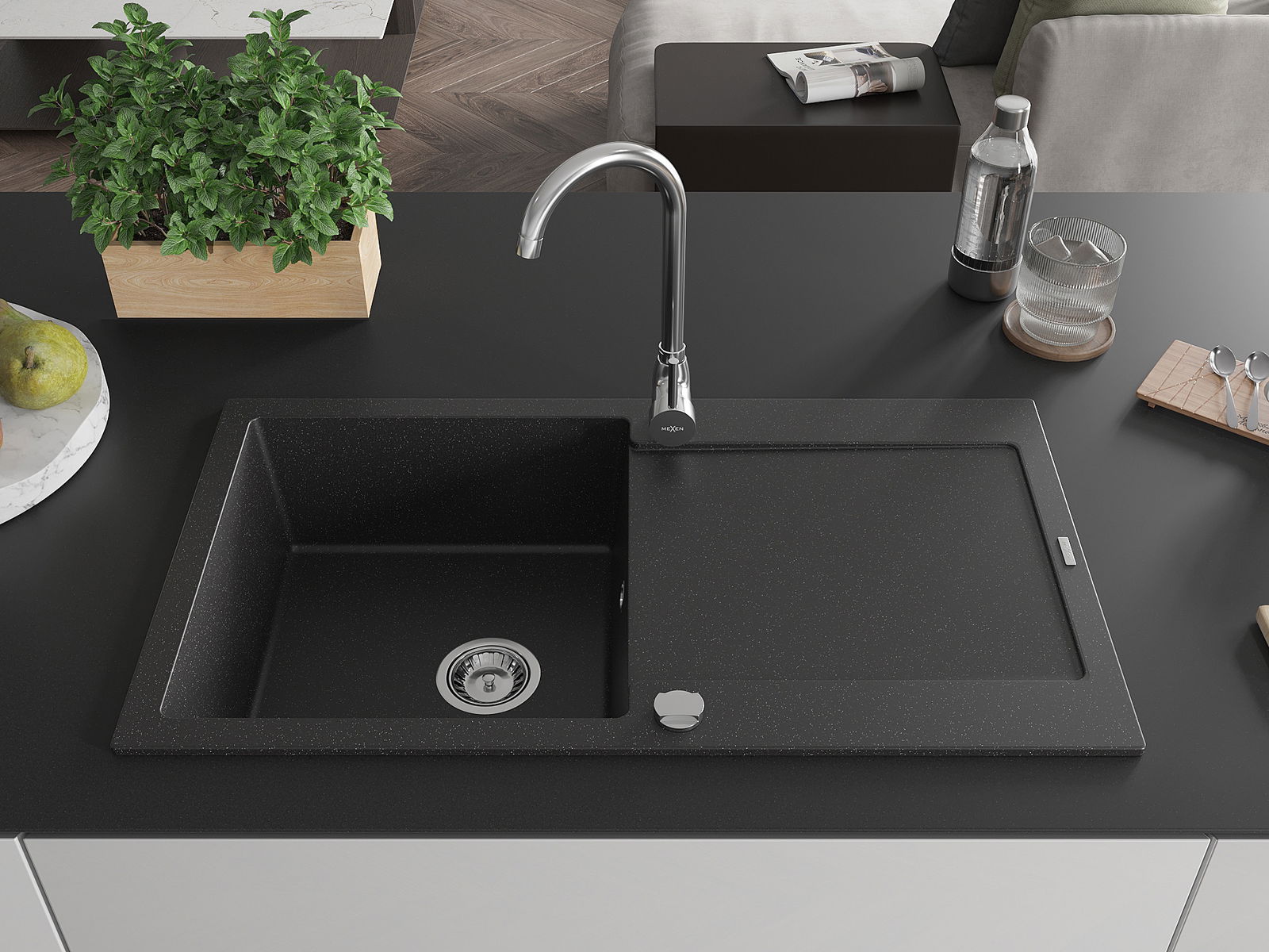 Mexen Leo granieten spoelbak 1-kompartement met afdruiprek 900 x 500 mm, zwart/zilvere metallic, chromen sifon - 6501901010-73