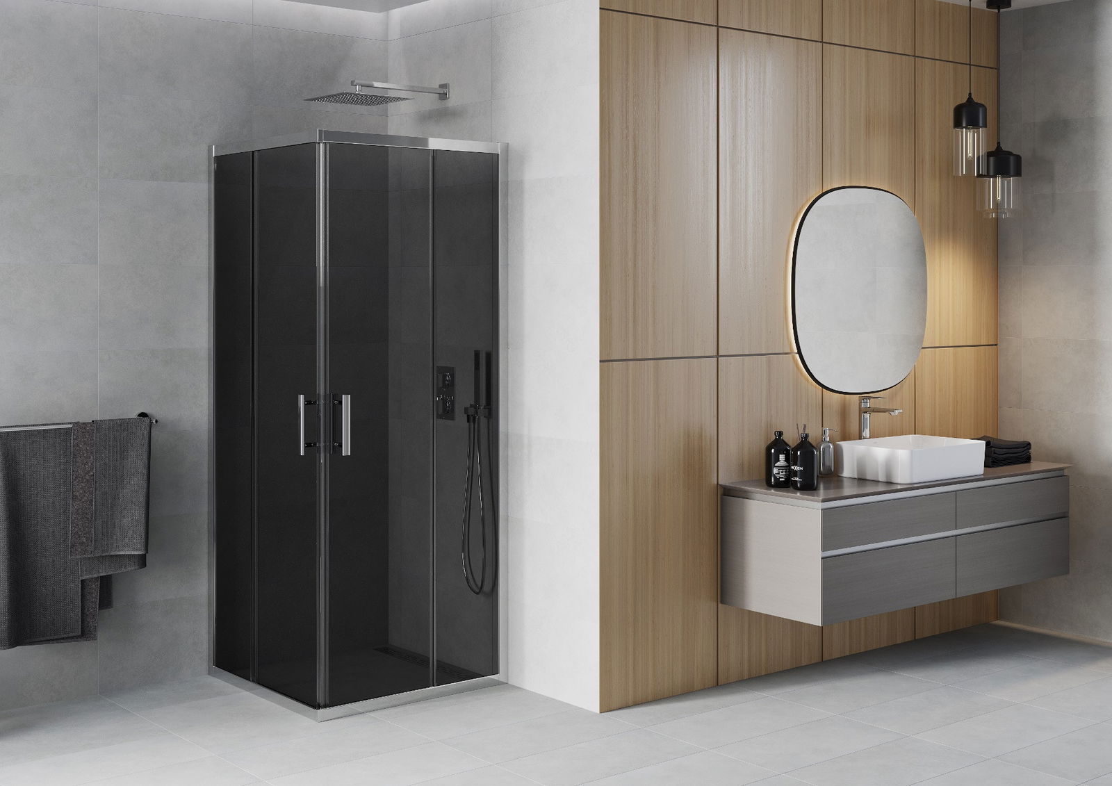 Handige en comfortabele greep is gemaakt van duurzaam en weerbestendig metaal. De modieuze vorm in combinatie met een afwerking die past bij de kleur van de profielen geeft het geheel een moderne en stijlvolle uitstraling, wat de esthetiek van elke badkamer benadrukt.