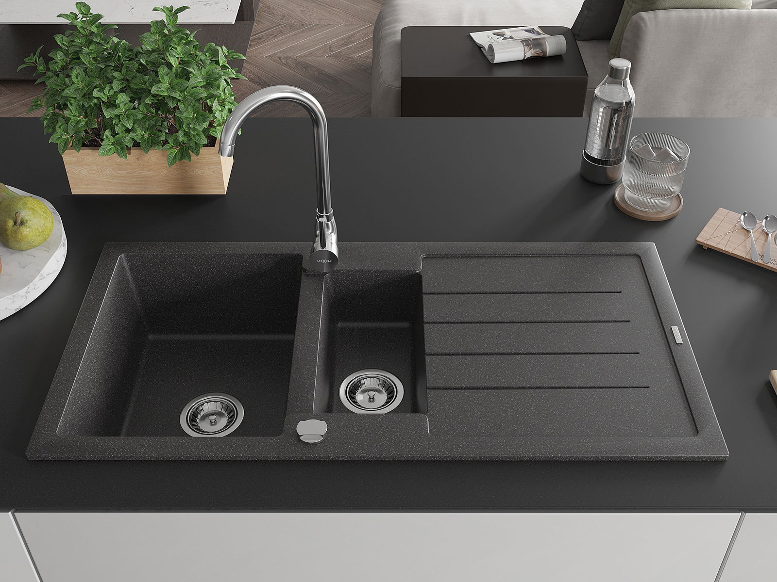 Mexen Andres granieten gootsteen 1,5-komor met afdruiprek 1000 x 500 mm, zwart gevlekt, chromen sifon - 6515101510-76