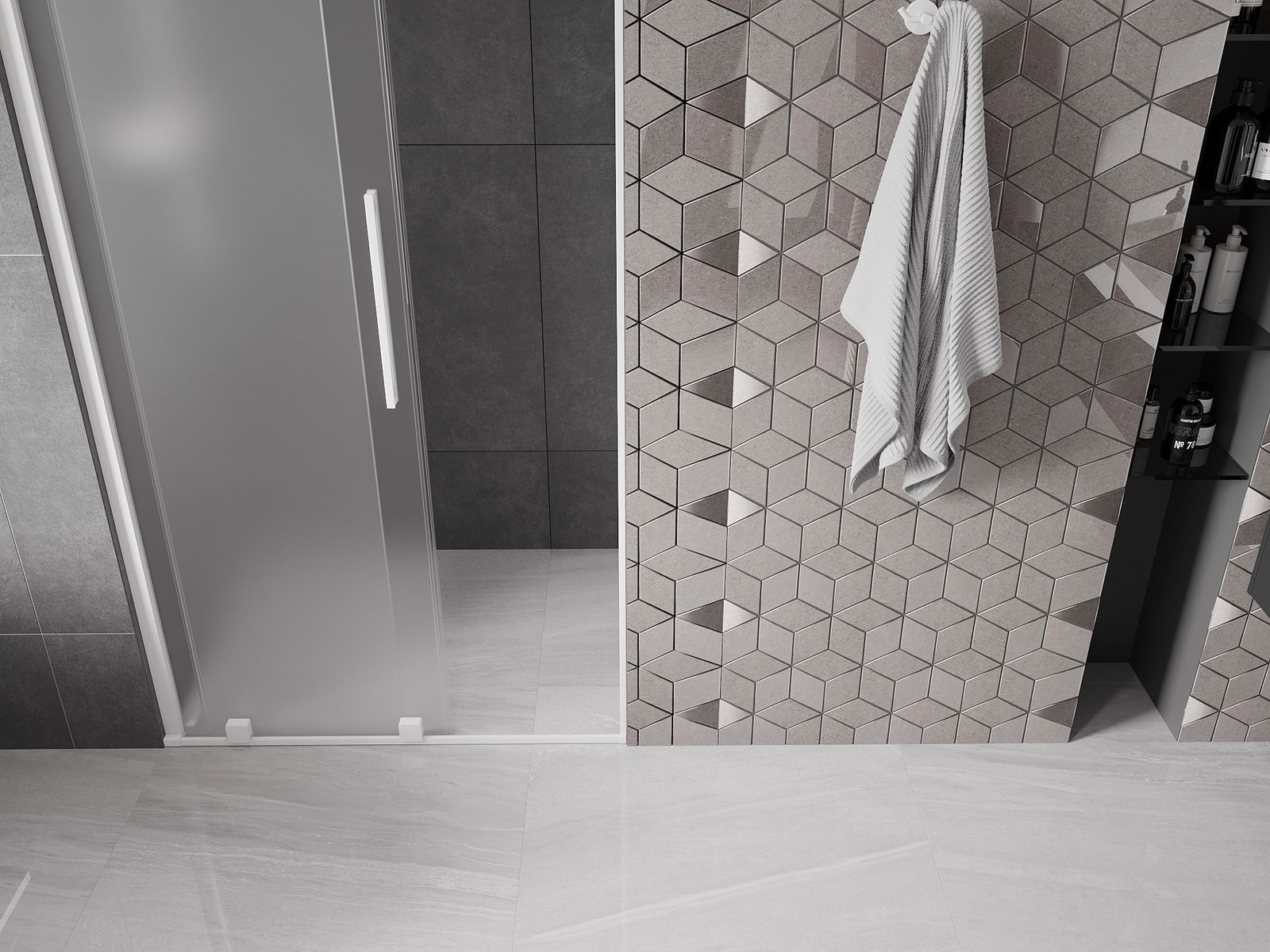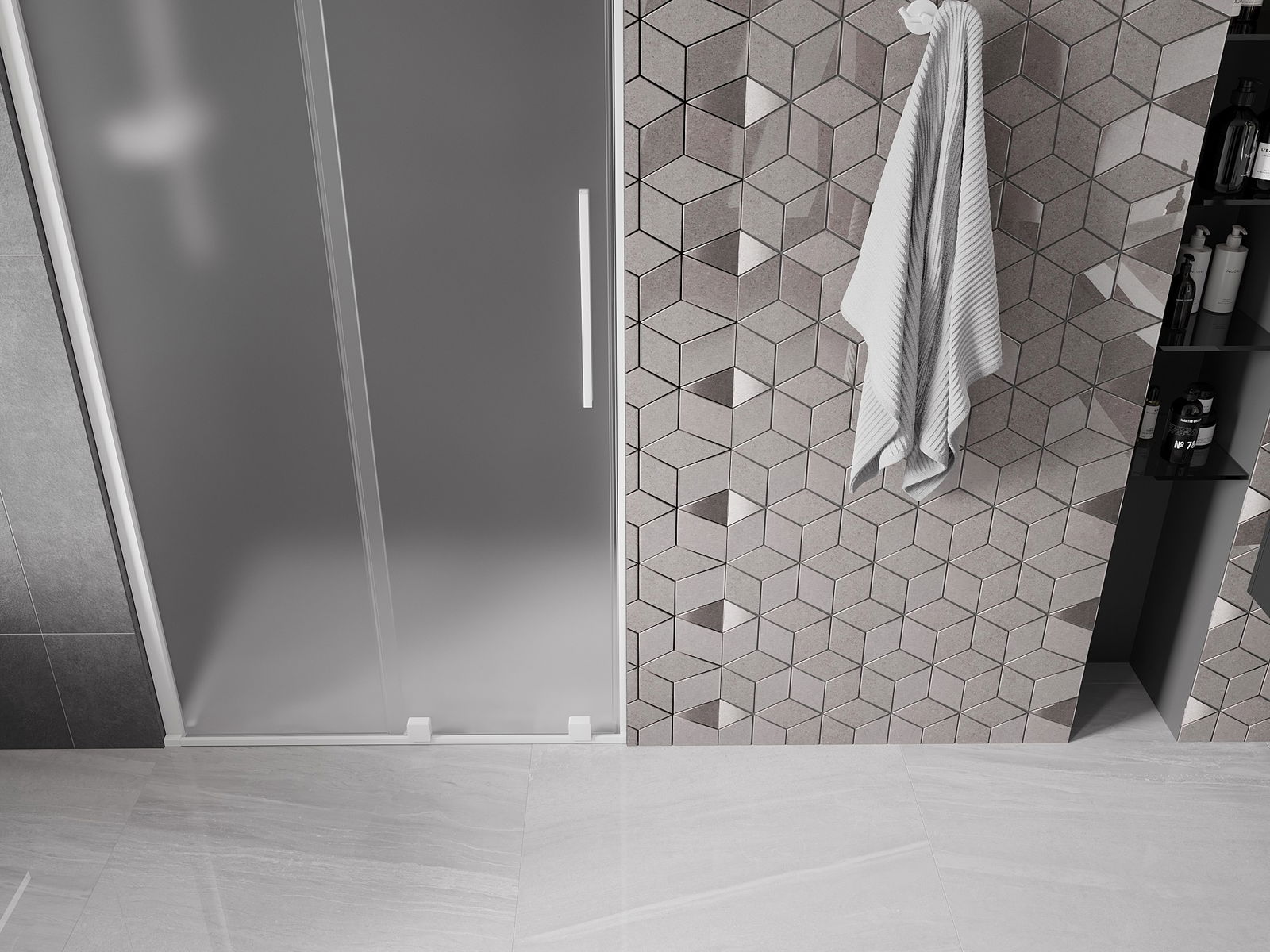 Het handige en comfortabele handvat is gemaakt van roestvrij staal. De modieuze vorm in combinatie met de afwerking die is afgestemd op de kleur van de profielen geeft het geheel een moderne en stijlvolle uitstraling, en benadrukt de esthetiek van elke badkamer.