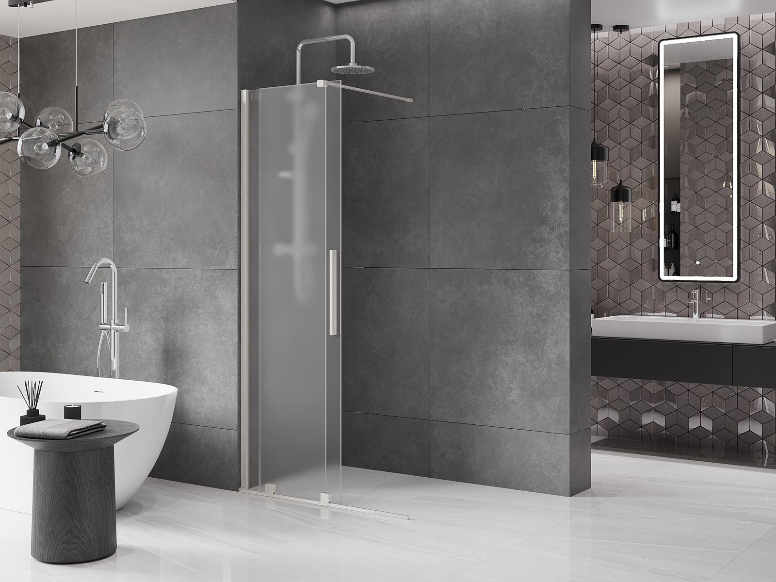 Het handige en comfortabele handvat is gemaakt van roestvrij staal. De modieuze vorm in combinatie met de afwerking die is afgestemd op de kleur van de profielen geeft het geheel een moderne en stijlvolle uitstraling, en benadrukt de esthetiek van elke badkamer.