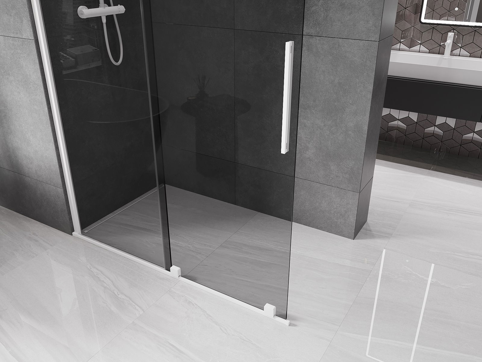 Het handige en comfortabele handvat is gemaakt van roestvrij staal. De modieuze vorm in combinatie met de afwerking die is afgestemd op de kleur van de profielen geeft het geheel een moderne en stijlvolle uitstraling, en benadrukt de esthetiek van elke badkamer.