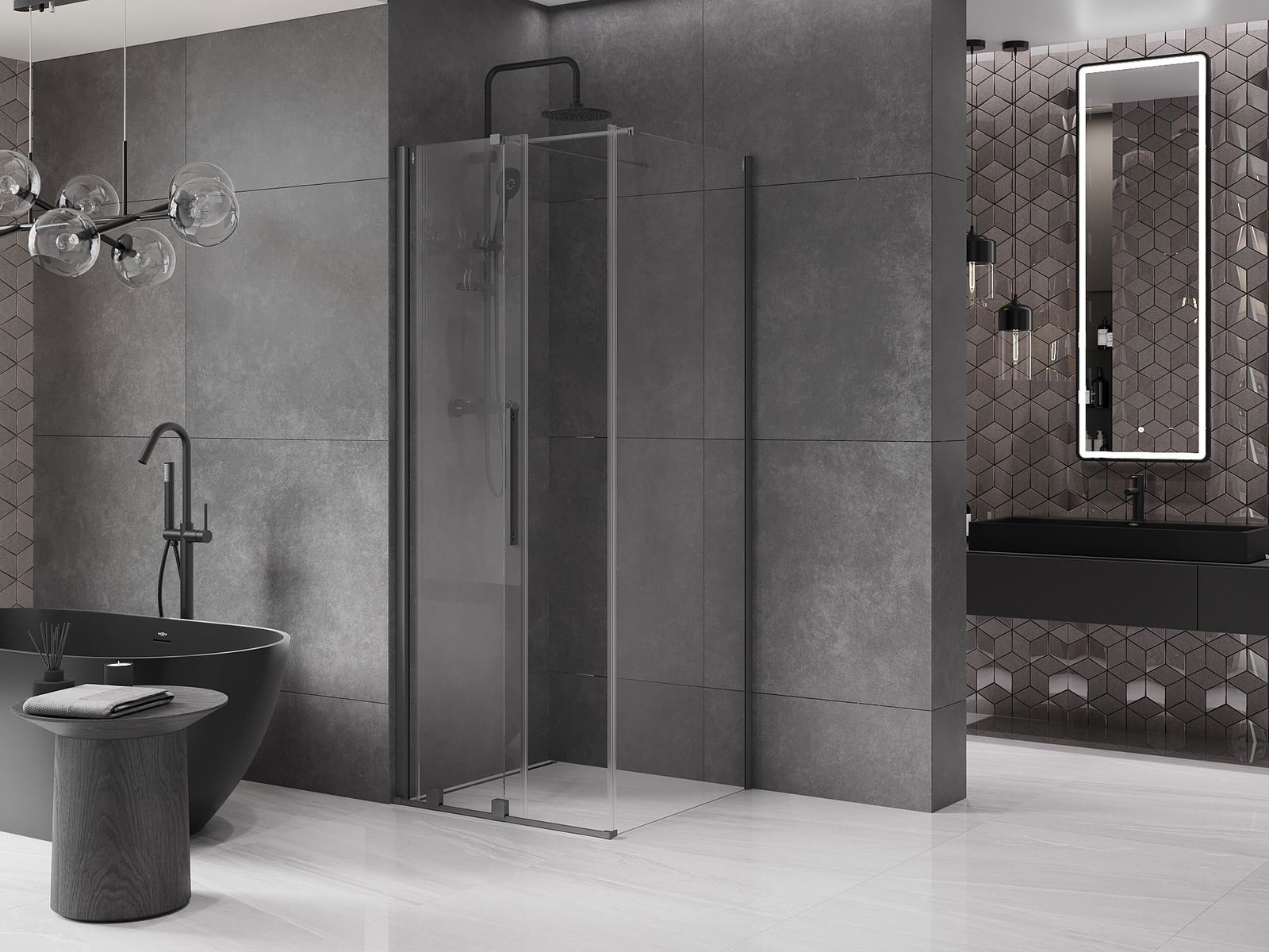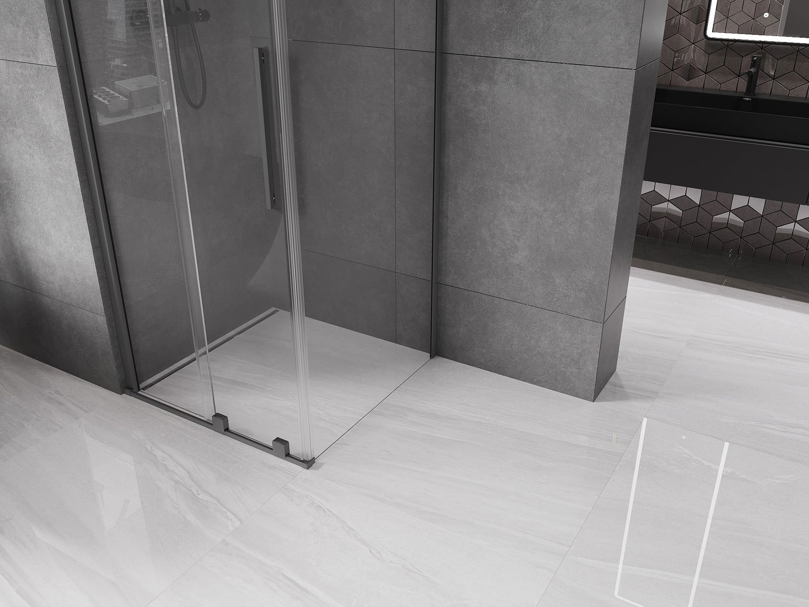 Het handige en comfortabele handvat is gemaakt van roestvrij staal. De modieuze vorm in combinatie met de afwerking die is afgestemd op de kleur van de profielen geeft het geheel een moderne en stijlvolle uitstraling, en benadrukt de esthetiek van elke badkamer.