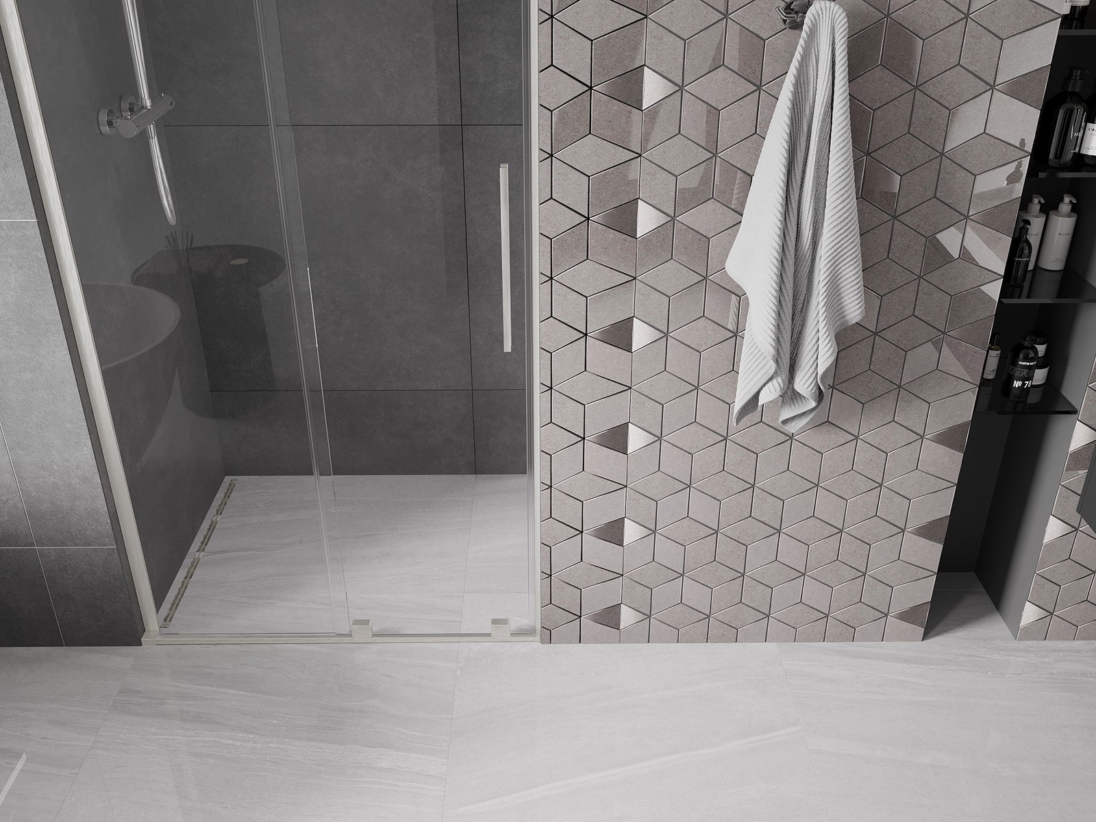 Het handige en comfortabele handvat is gemaakt van roestvrij staal. De modieuze vorm in combinatie met de afwerking die is afgestemd op de kleur van de profielen geeft het geheel een moderne en stijlvolle uitstraling, en benadrukt de esthetiek van elke badkamer.