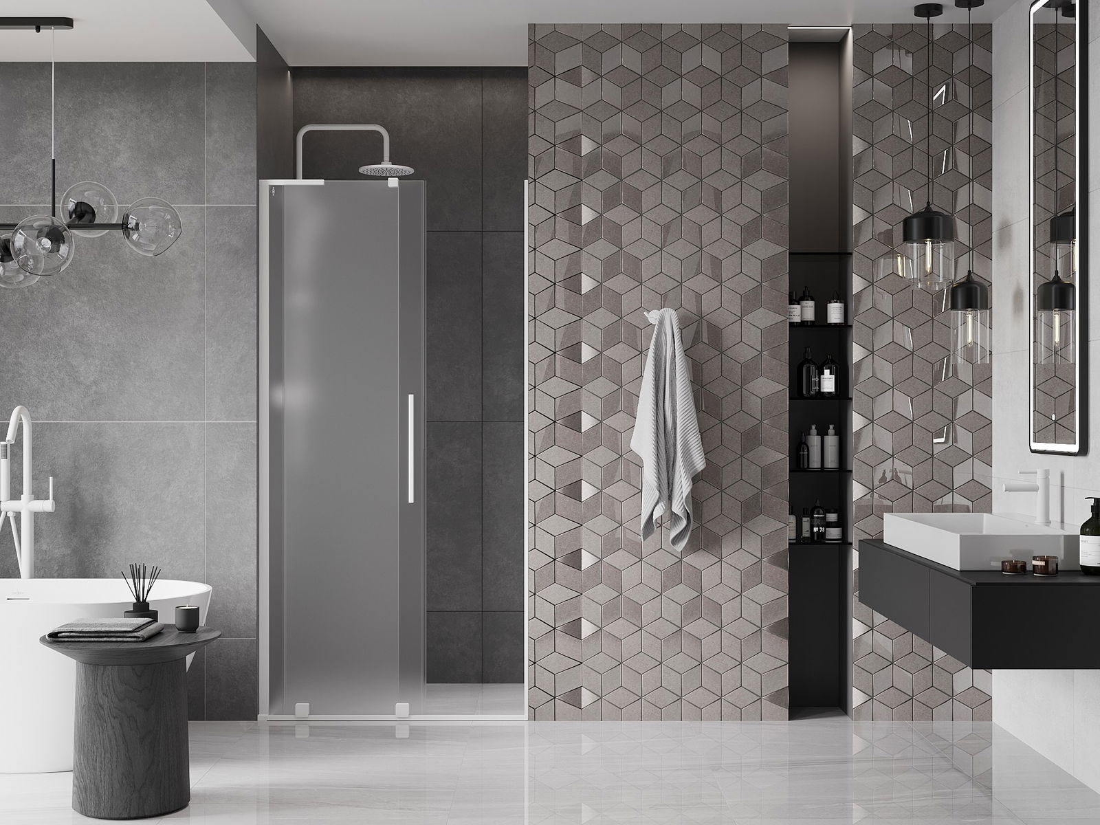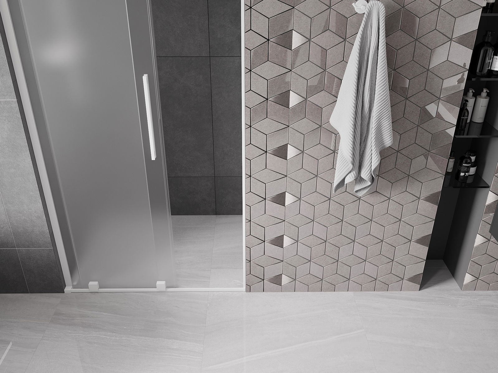 Het handige en comfortabele handvat is gemaakt van roestvrij staal. De modieuze vorm in combinatie met de afwerking die is afgestemd op de kleur van de profielen geeft het geheel een moderne en stijlvolle uitstraling, en benadrukt de esthetiek van elke badkamer.