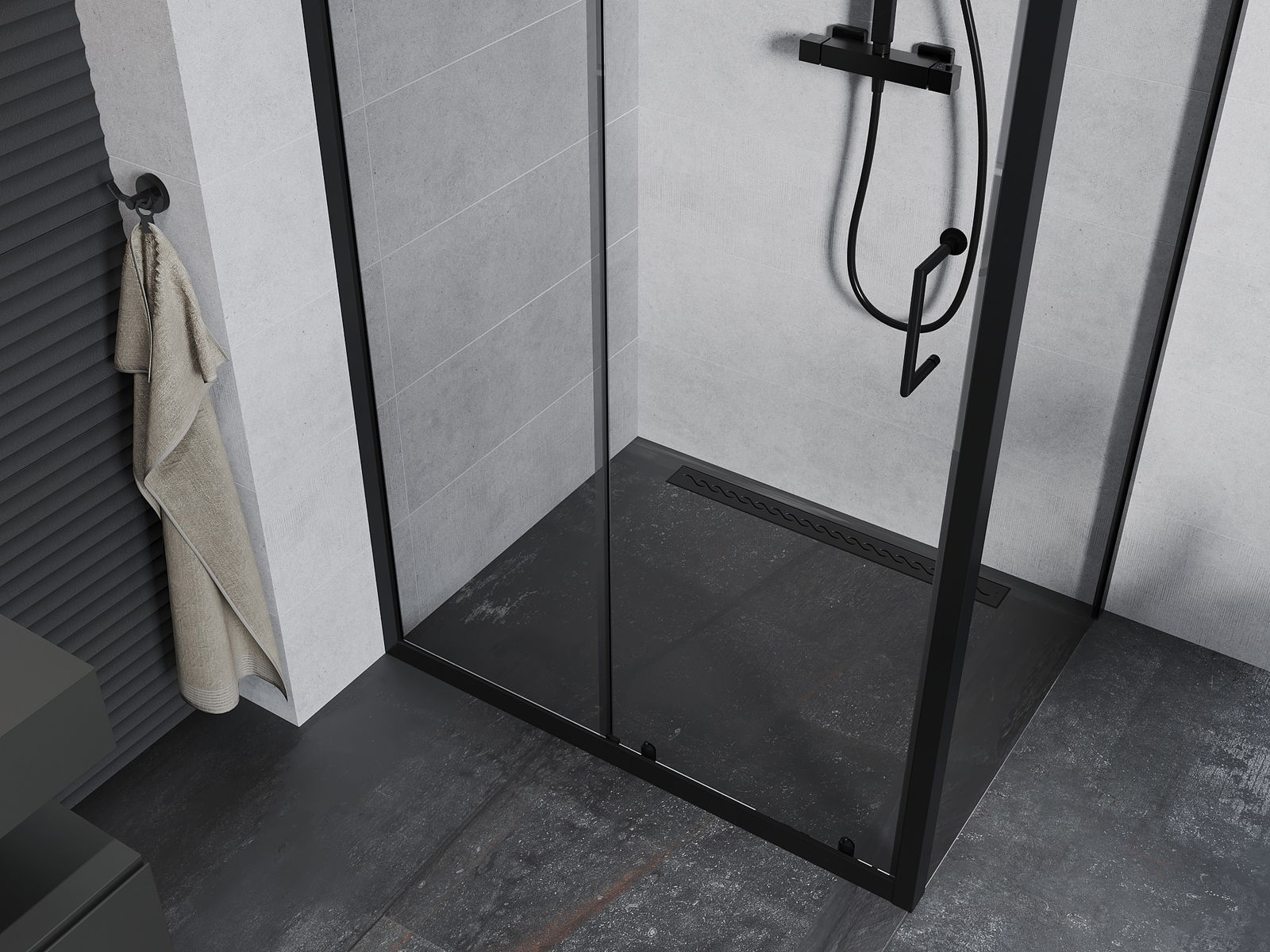 Handige en comfortabele greep is gemaakt van duurzaam en weerbestendig metaal. De modieuze vorm in combinatie met een afwerking die past bij de kleur van de profielen geeft het geheel een moderne en stijlvolle uitstraling, wat de esthetiek van elke badkamer benadrukt.