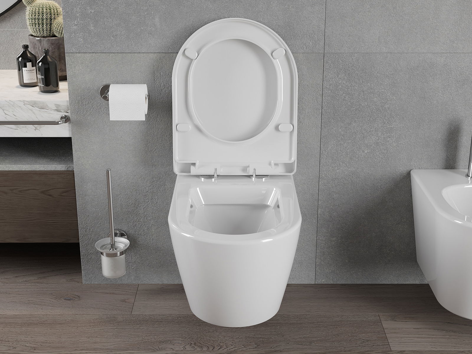 De zelfsluitende toiletbril is uitgerust met een speciaal systeem dat het snelle en plotselinge vallen ervan remt. Het systeem elimineert effectief het probleem van klapperen met de bril en minimaliseert geluid, waardoor een soepele en stille sluiting van het toilet wordt gegarandeerd.